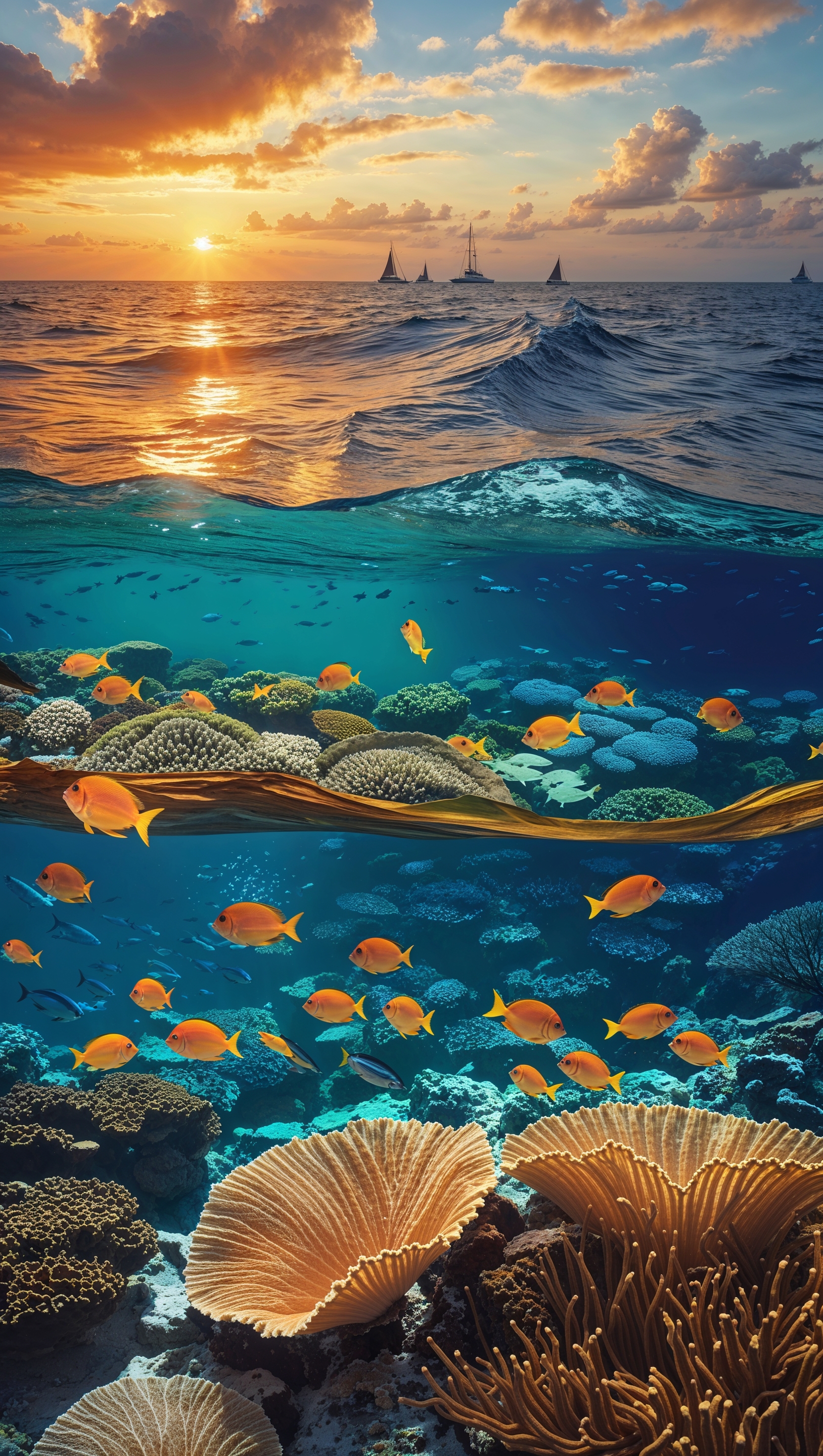 1664x2944 Ocean split view with above-water sunset and below-water coral reef