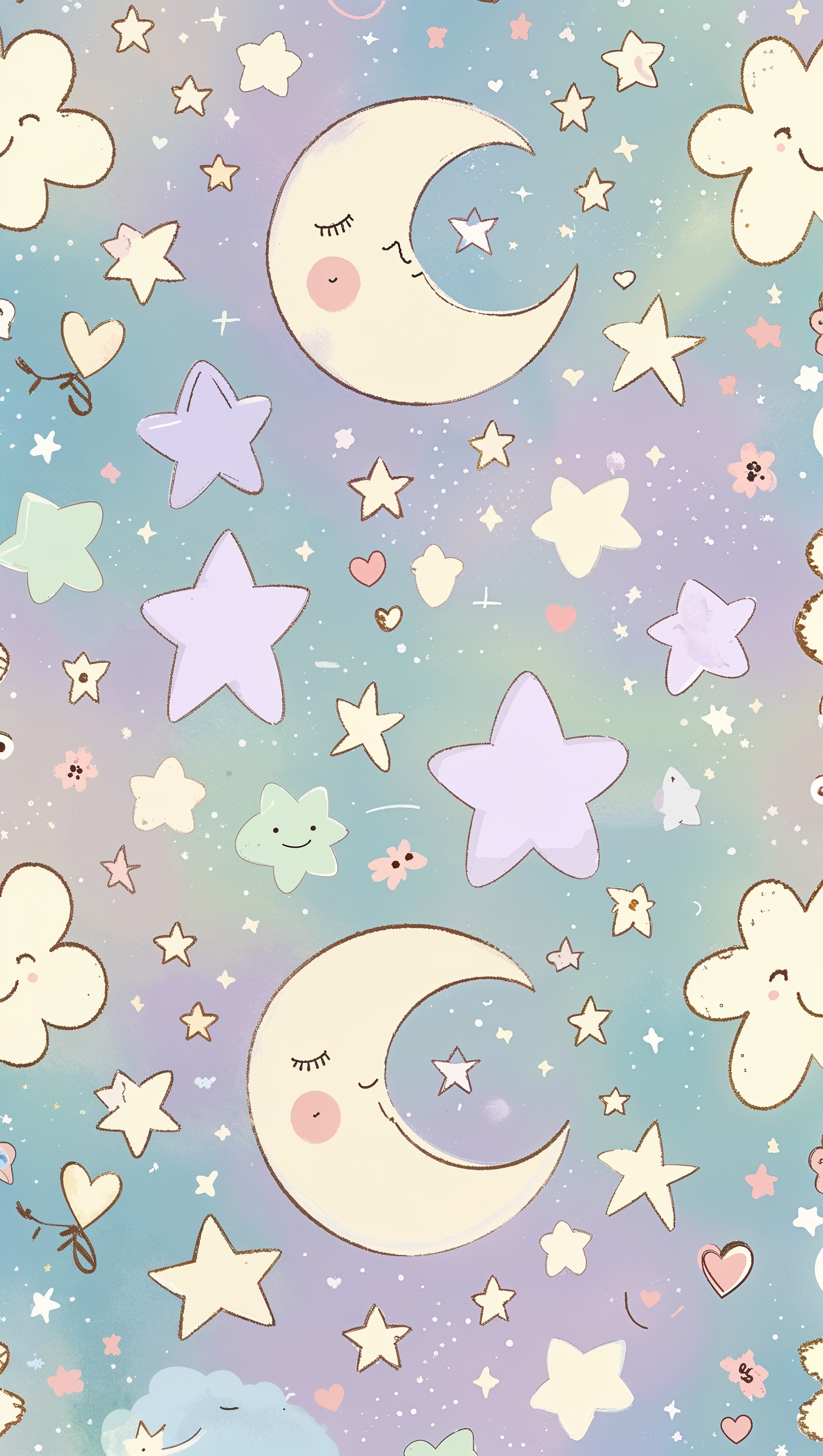 1664x2944 Pastel-themed kawaii background with stars, moons, and happy doodles