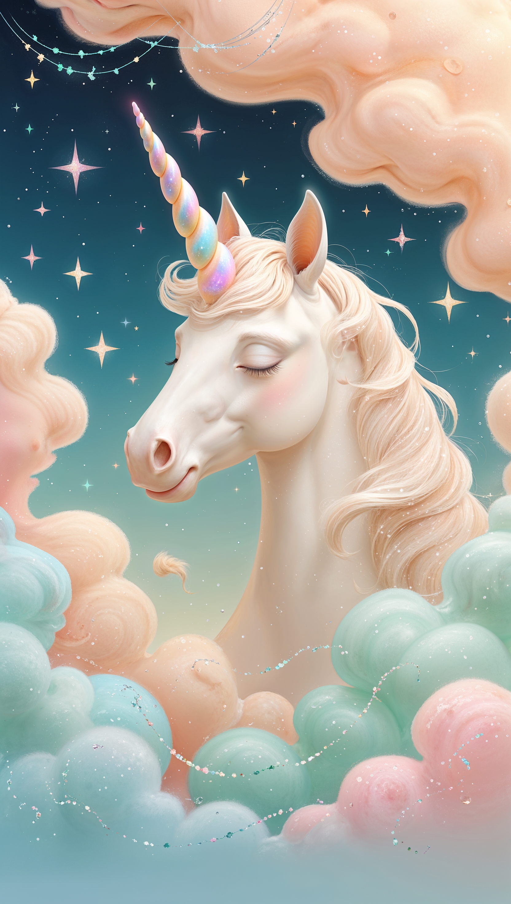 1664x2944 Cute pastel unicorn surrounded by clouds and stars in soft tones