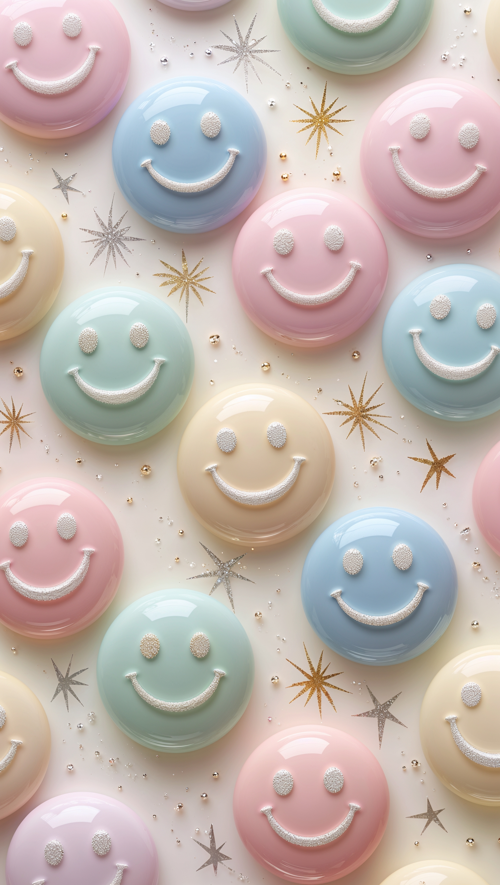 1664x2944 Vertical iPhone wallpaper with pastel smiley faces and sparkles, cute and playful