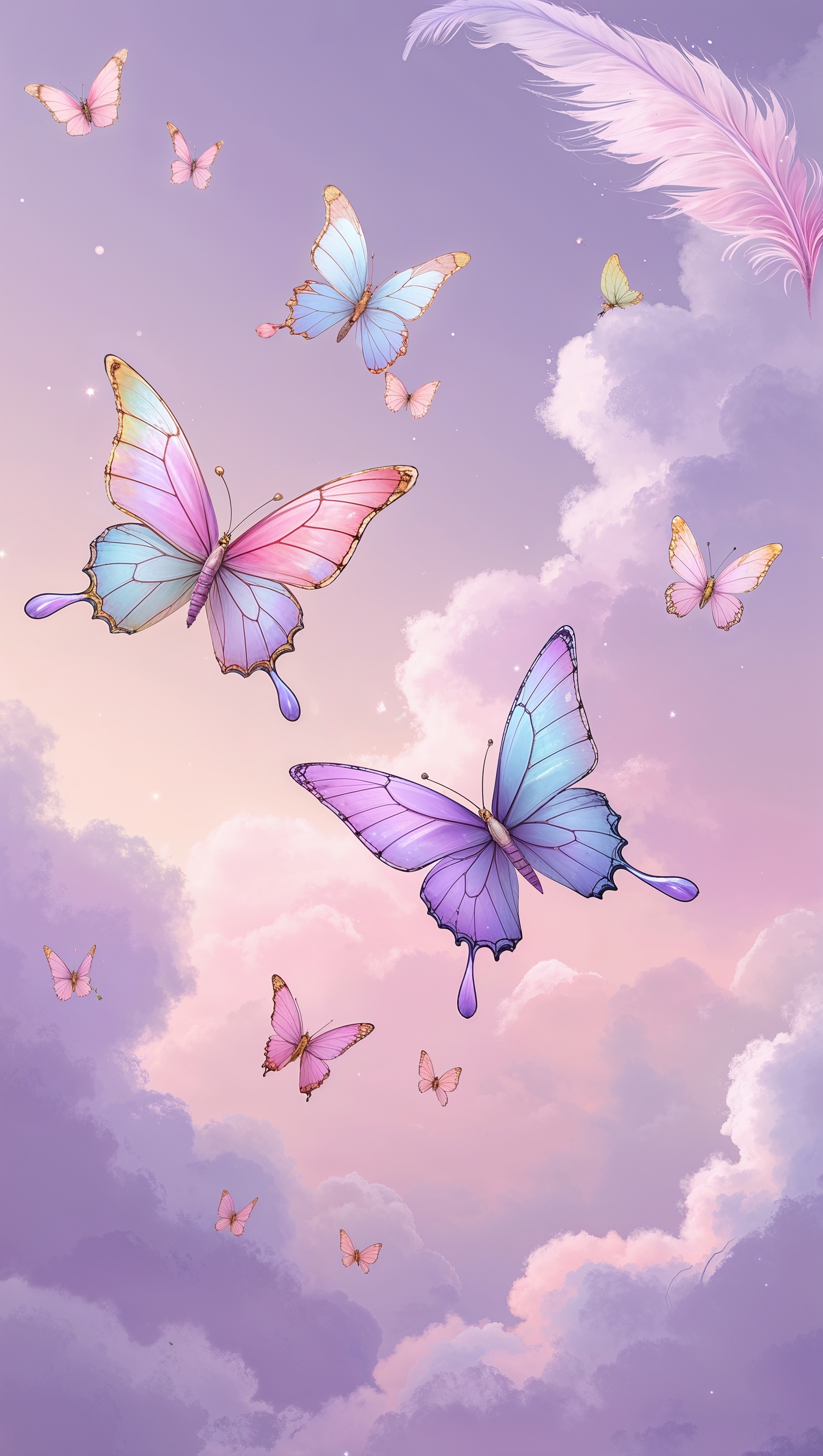 1664x2944 Stylized pastel butterflies floating across soft pink and lavender skies