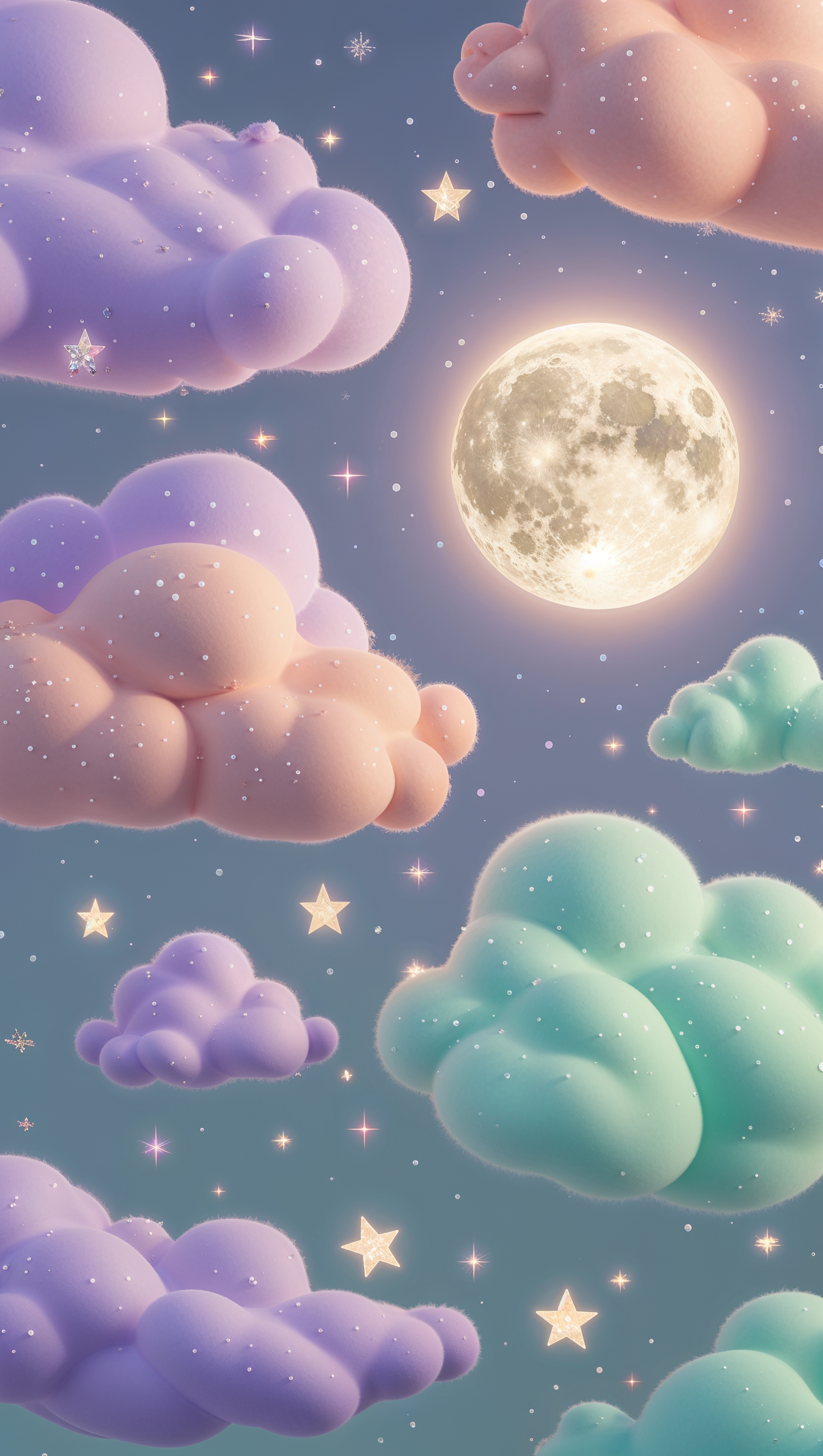1664x2944 Pastel clouds with stars and glowing moon, celestial dreamy vibe