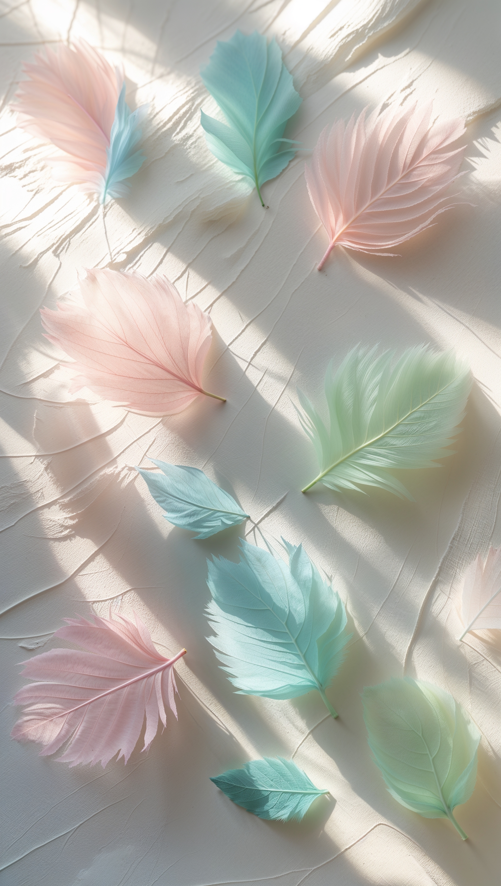 1664x2944 Delicate pastel leaves scattered across clean white background