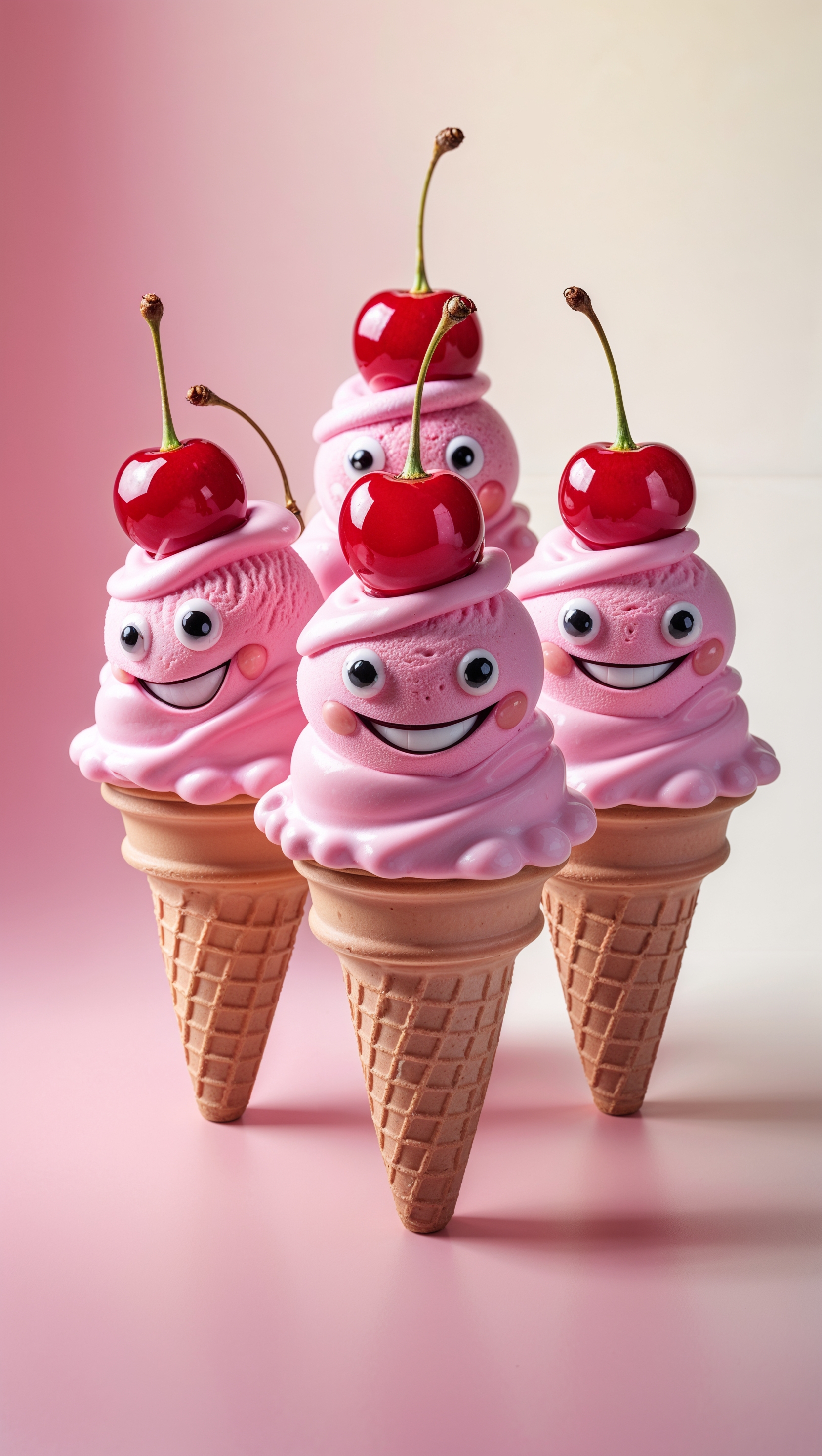 Smiling ice cream cones with cherry toppings on pale pink 1664x2944 Smiling ice cream cones with cherry toppings on pale pink