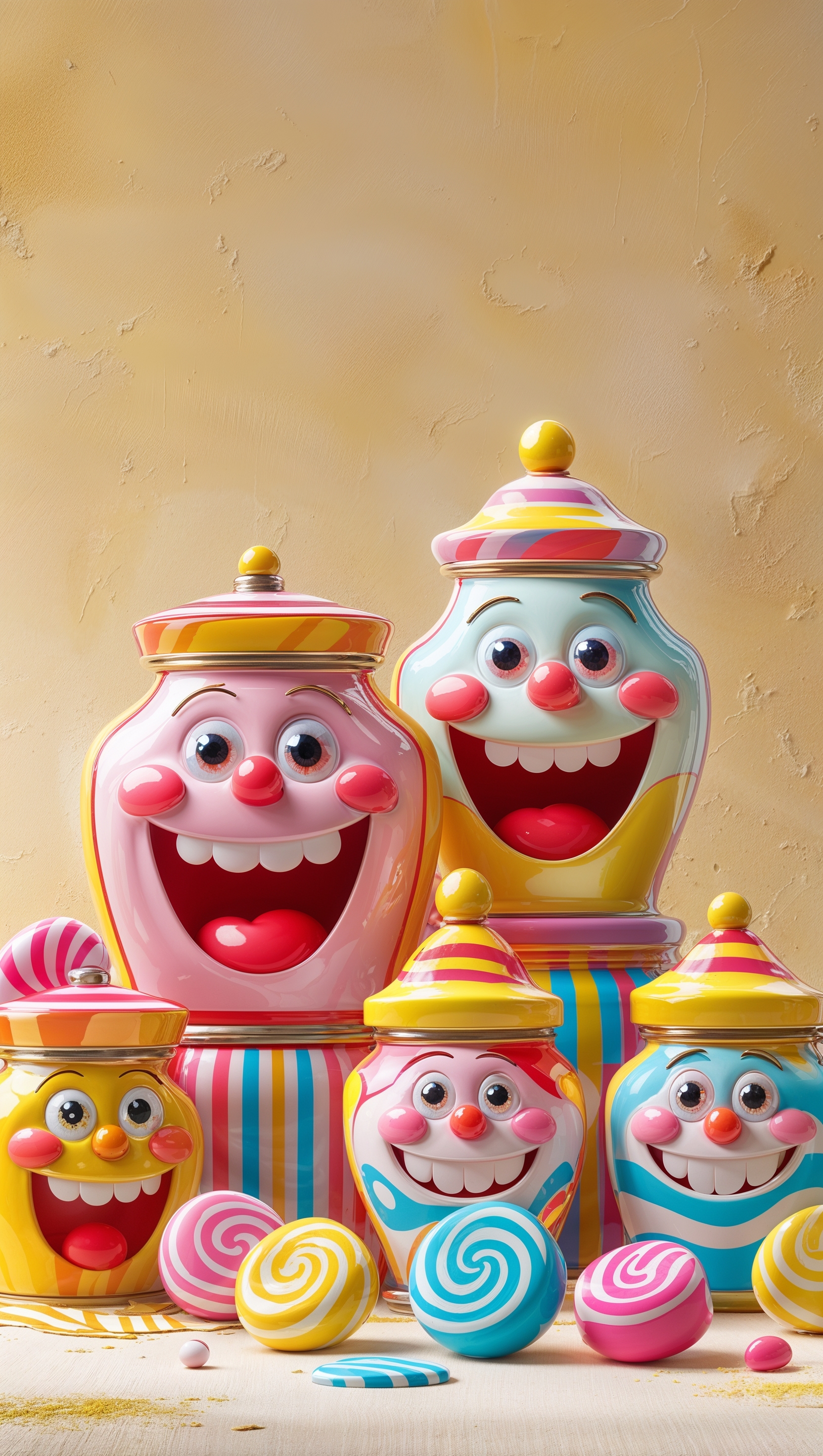 Cartoon candy jars with smiling faces on pastel yellow background 1664x2944 Cartoon candy jars with smiling faces on pastel yellow background