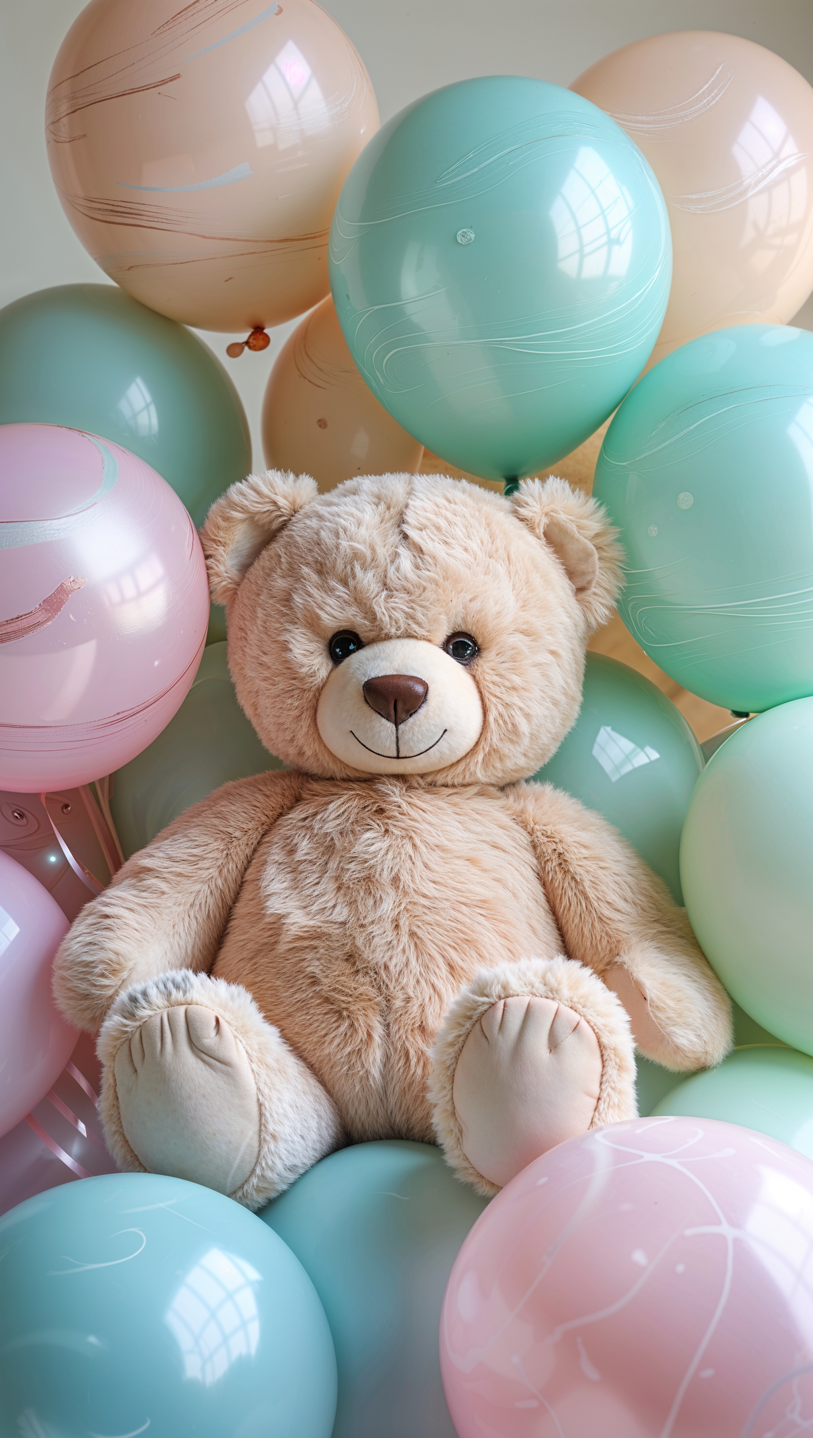 Cute teddy bear sitting among pastel-colored balloons 1664x2944 Cute teddy bear sitting among pastel-colored balloons