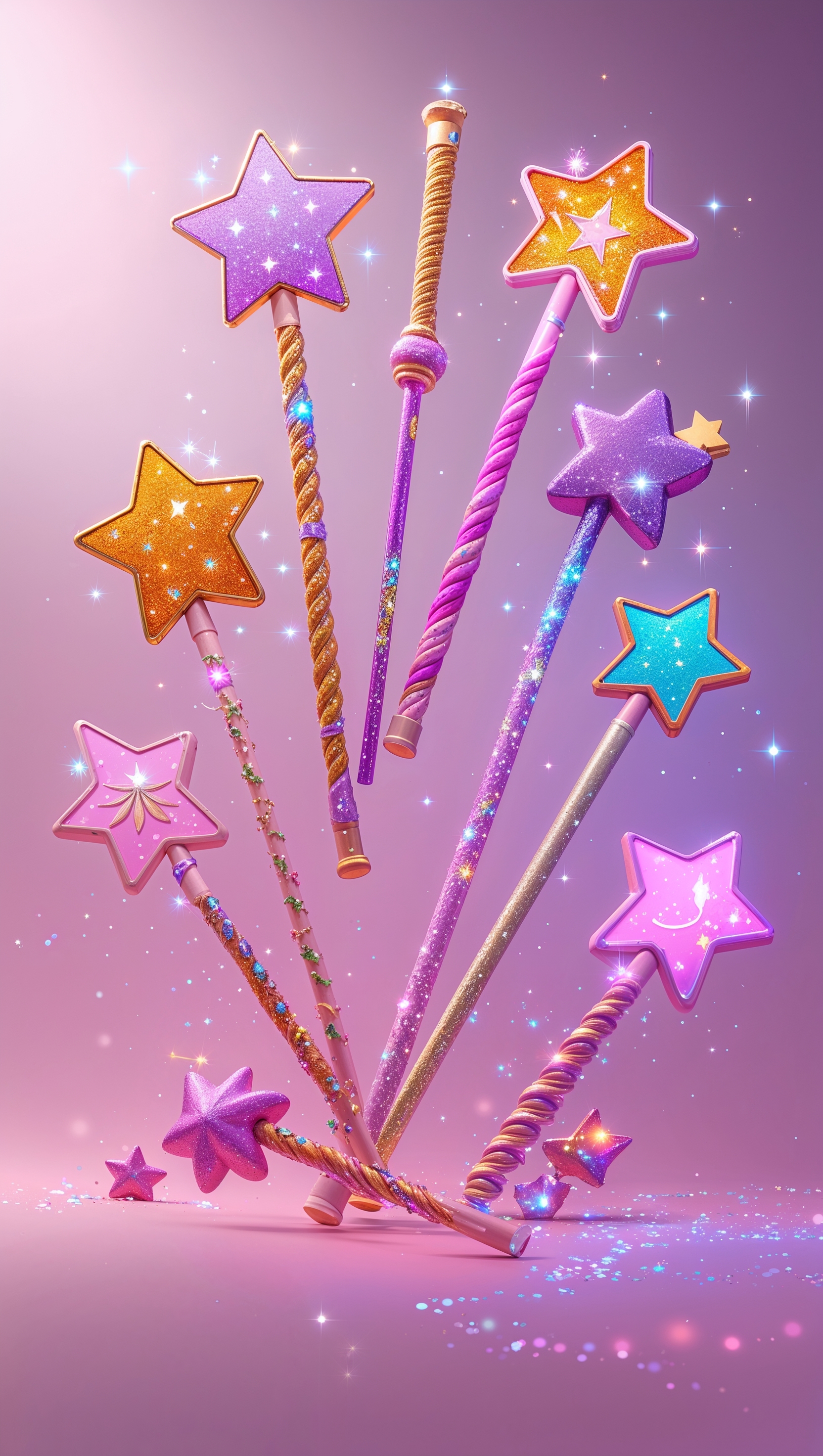 Cartoon fairy wands with stars and glitter on soft pink backdrop 1664x2944 Cartoon fairy wands with stars and glitter on soft pink backdrop