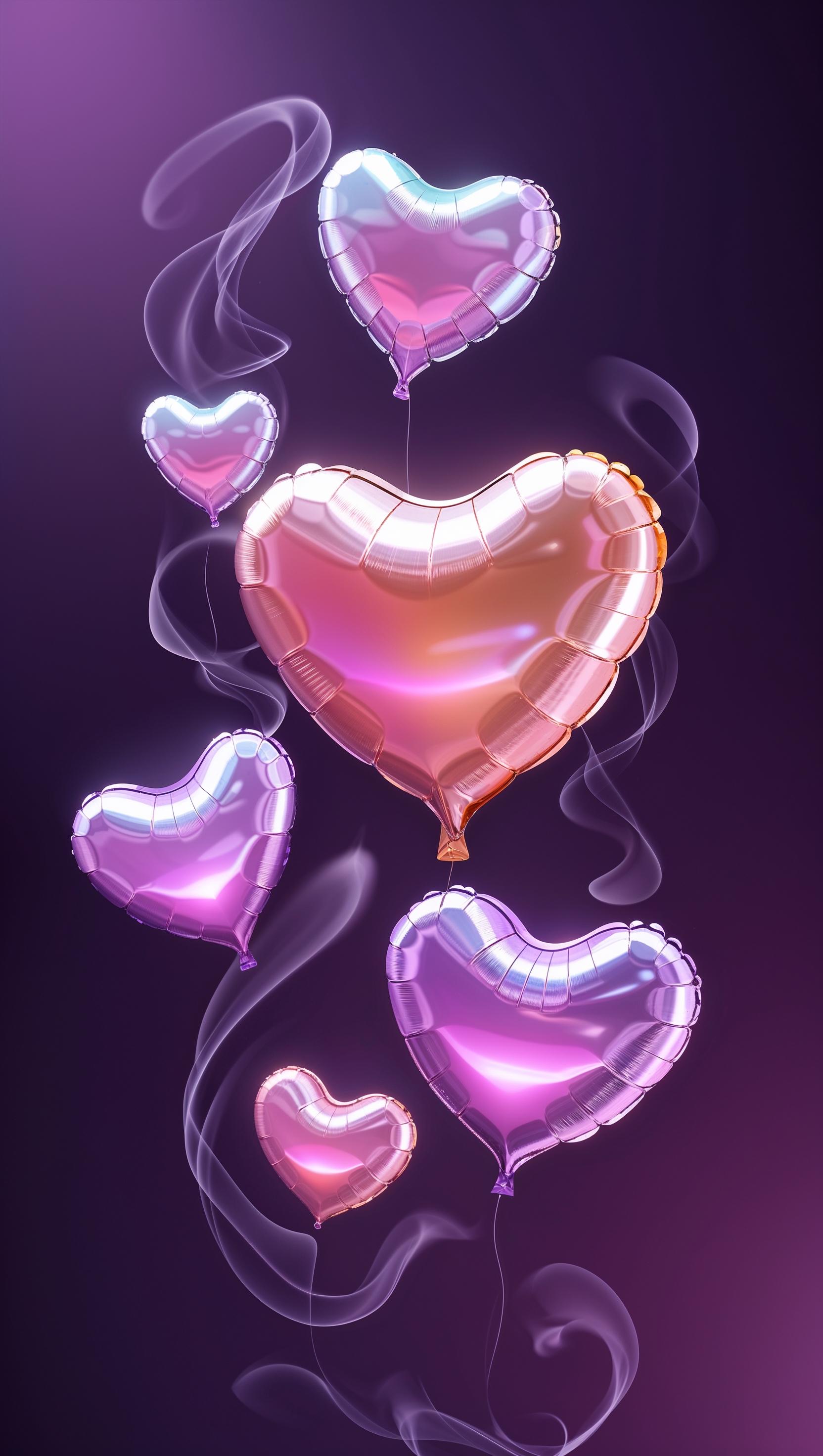 Glowing heart-shaped balloons floating on dark purple background 1664x2944 Glowing heart-shaped balloons floating on dark purple background