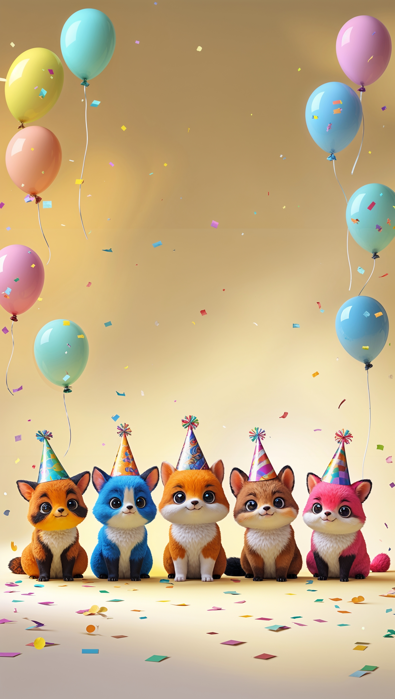 Chibi-style animals wearing party hats on soft yellow background 1664x2944 Chibi-style animals wearing party hats on soft yellow background