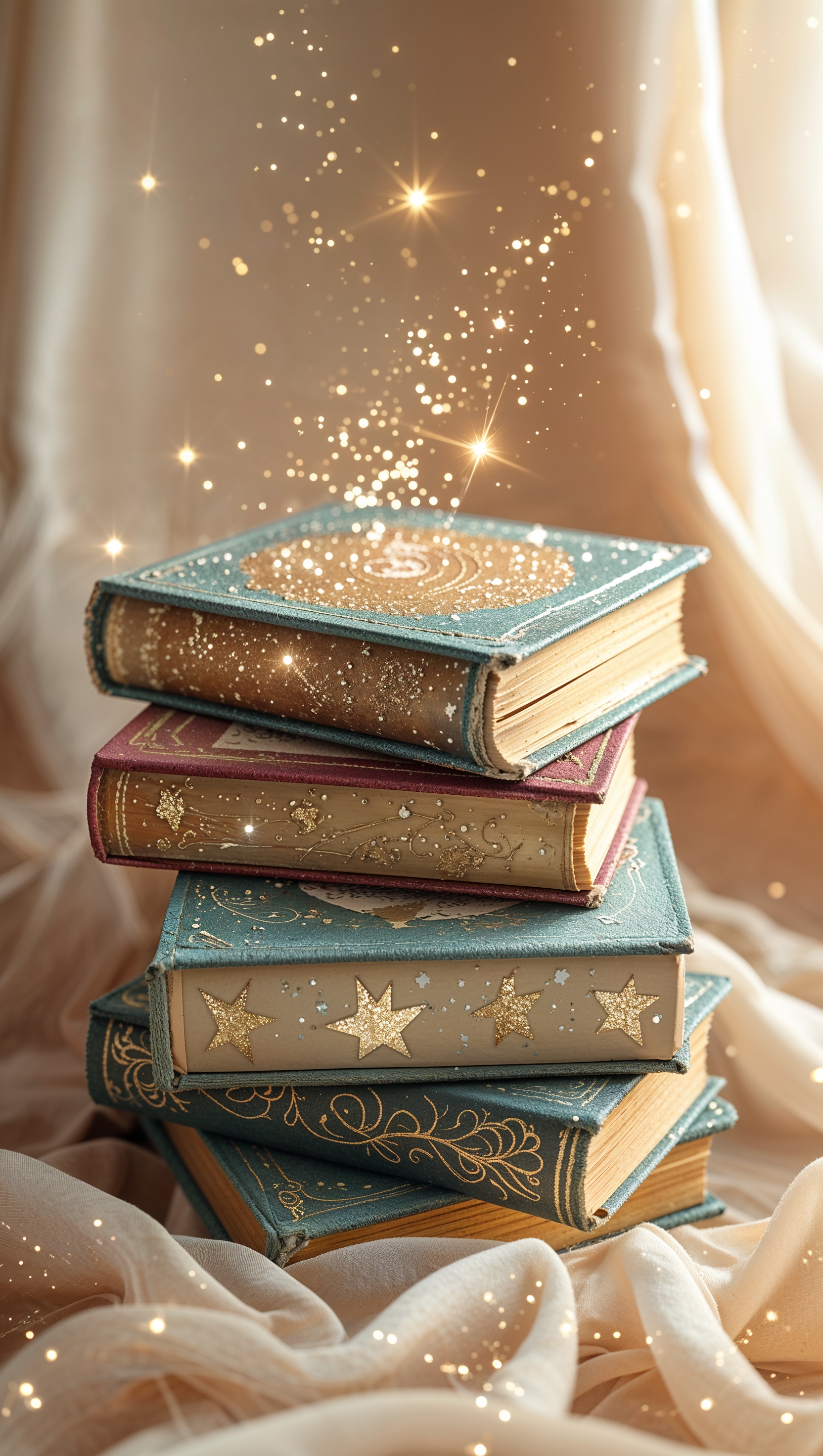 Cute magical books with stars and sparkles on pastel cream backdrop 1664x2944 Cute magical books with stars and sparkles on pastel cream backdrop