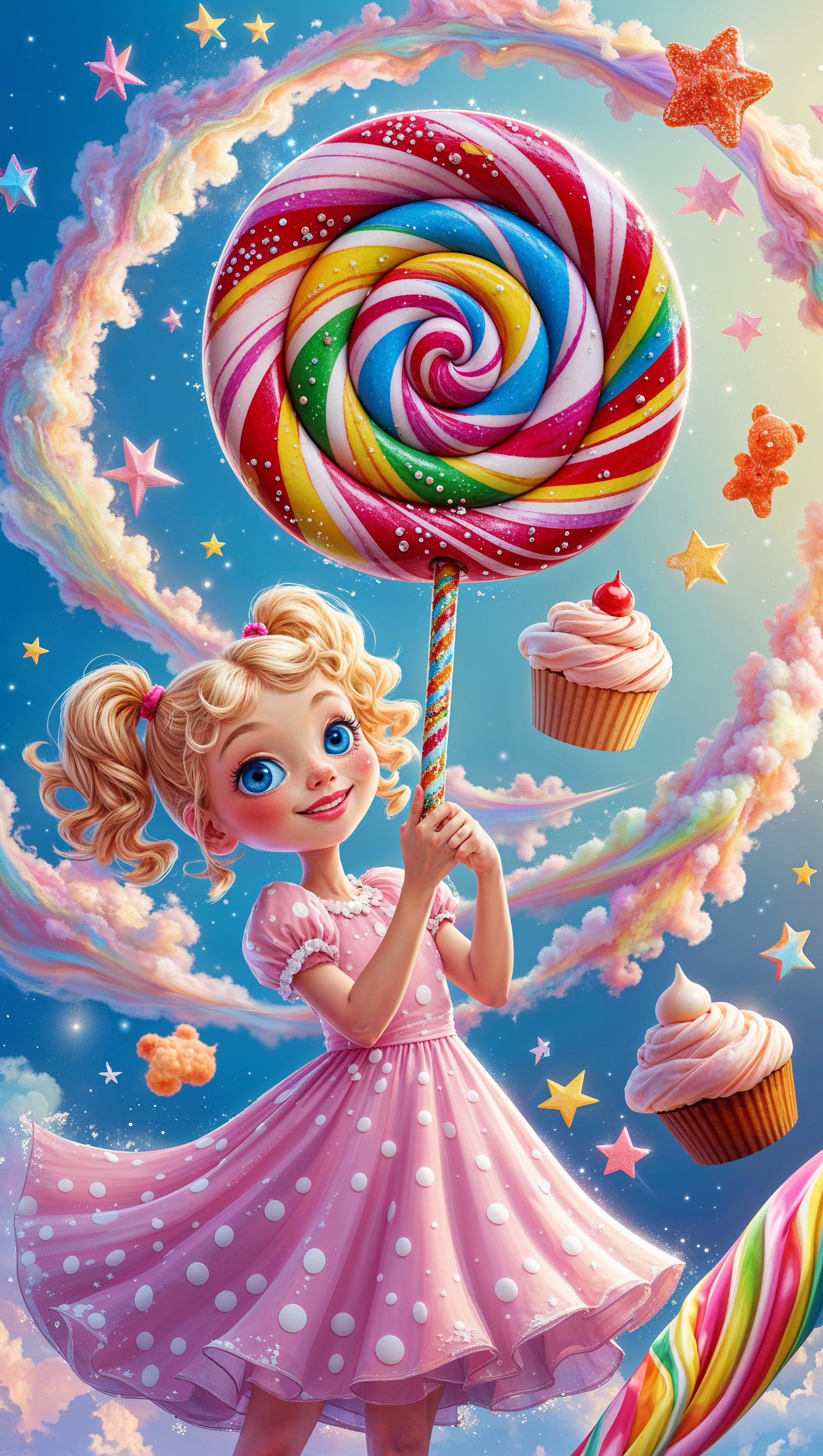 Cartoon girl holding a giant lollipop surrounded by candy and stars 1664x2944 Cartoon girl holding a giant lollipop surrounded by candy and stars