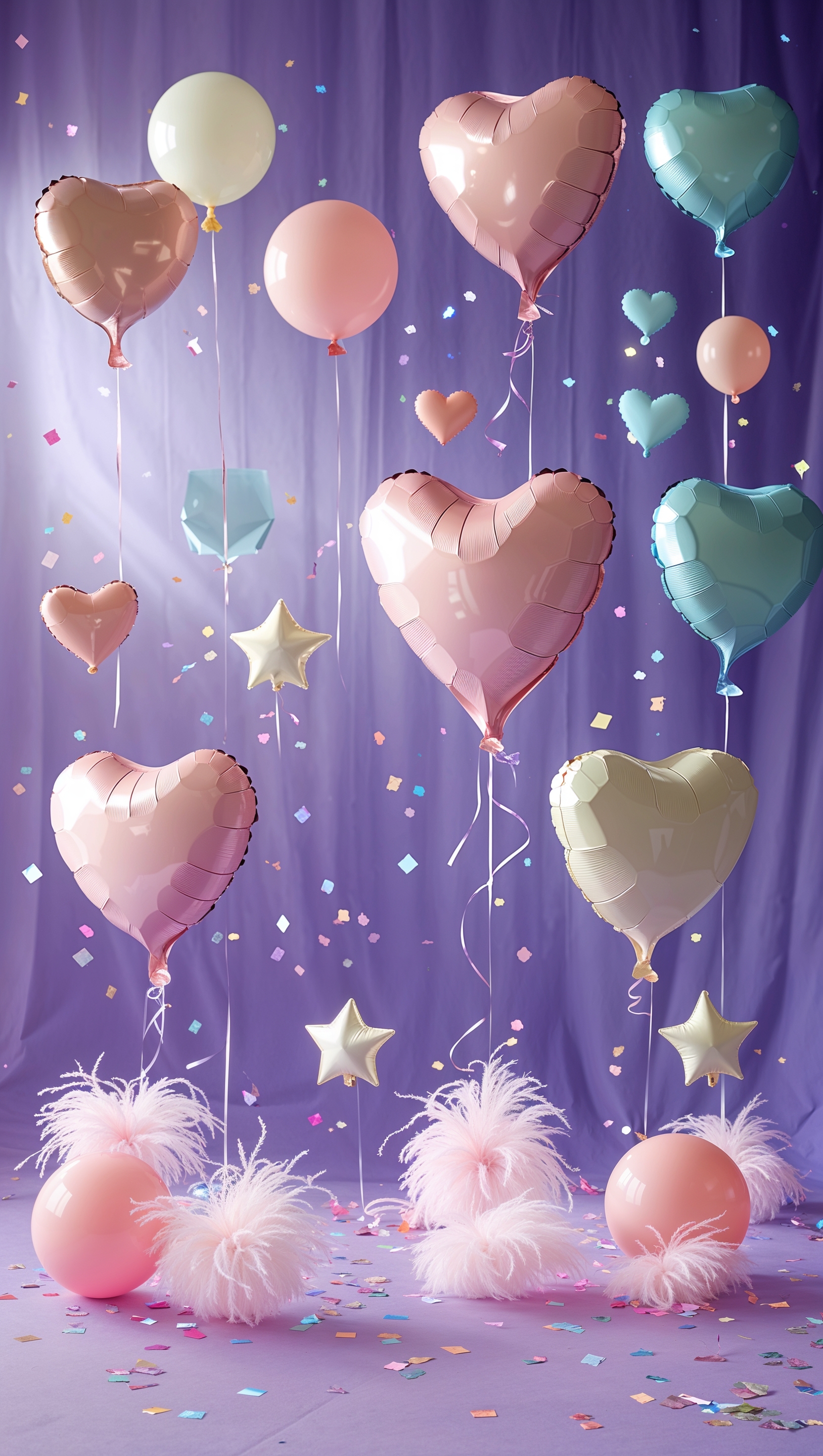 Soft purple background with floating balloons and confetti, girly party vibe 1664x2944 Soft purple background with floating balloons and confetti, girly party vibe