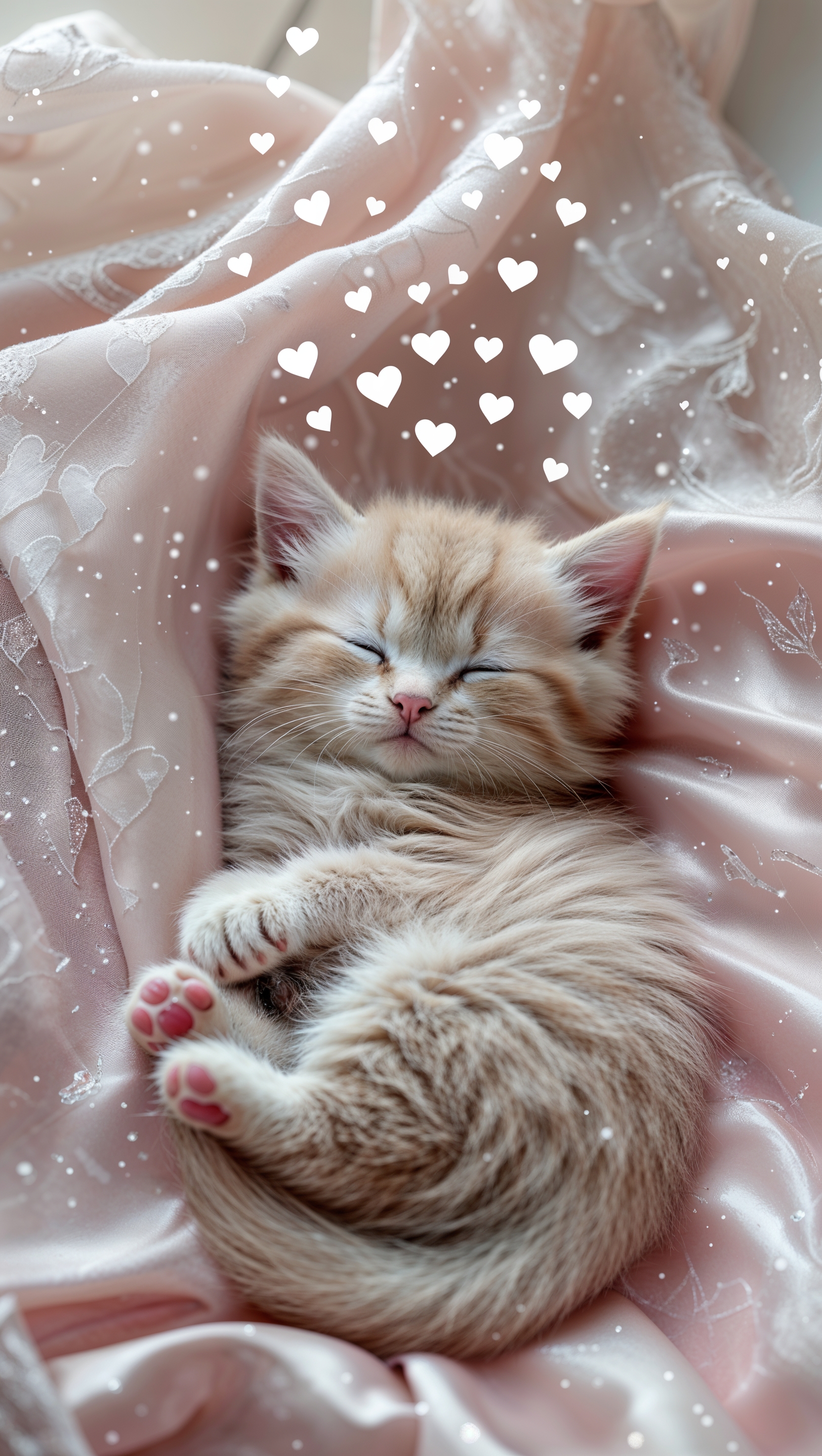 Cute kitten sleeping on a pastel blanket with hearts floating above 1664x2944 Cute kitten sleeping on a pastel blanket with hearts floating above