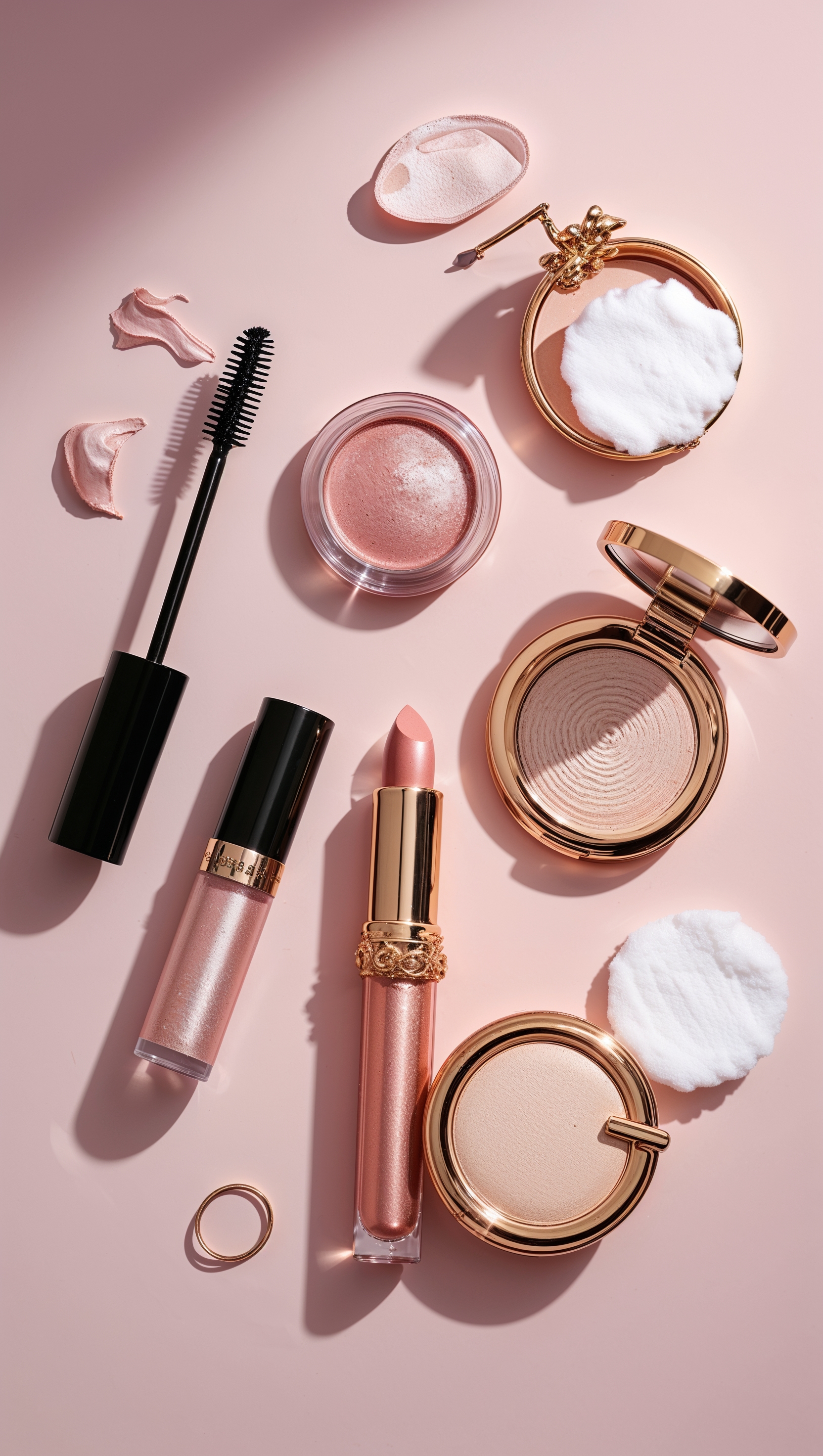 Girly makeup essentials flat lay with soft pink background 1664x2944 Girly makeup essentials flat lay with soft pink background
