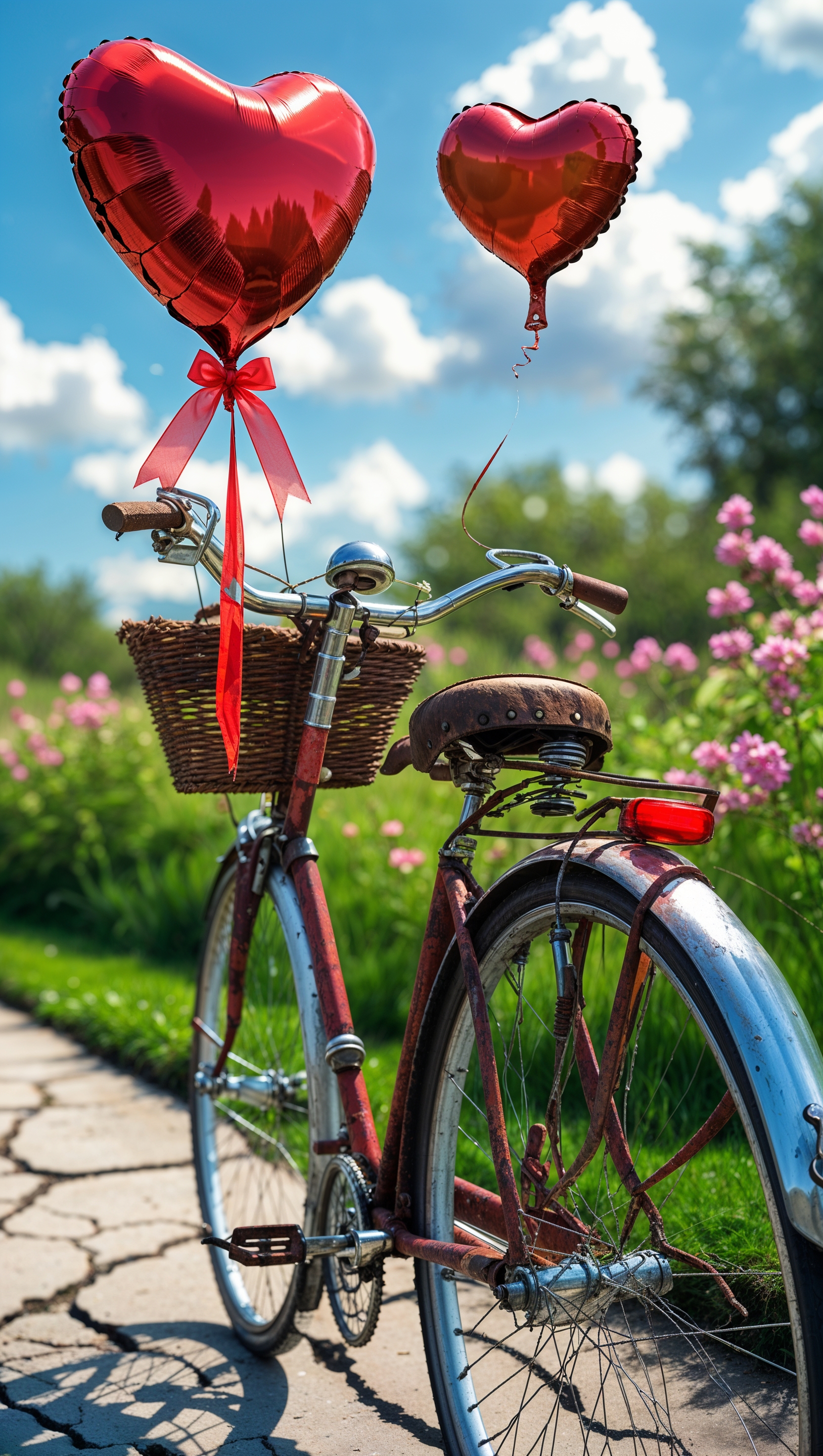 Heart-shaped balloons tied to a vintage bicycle on a sunny day 1664x2944 Heart-shaped balloons tied to a vintage bicycle on a sunny day