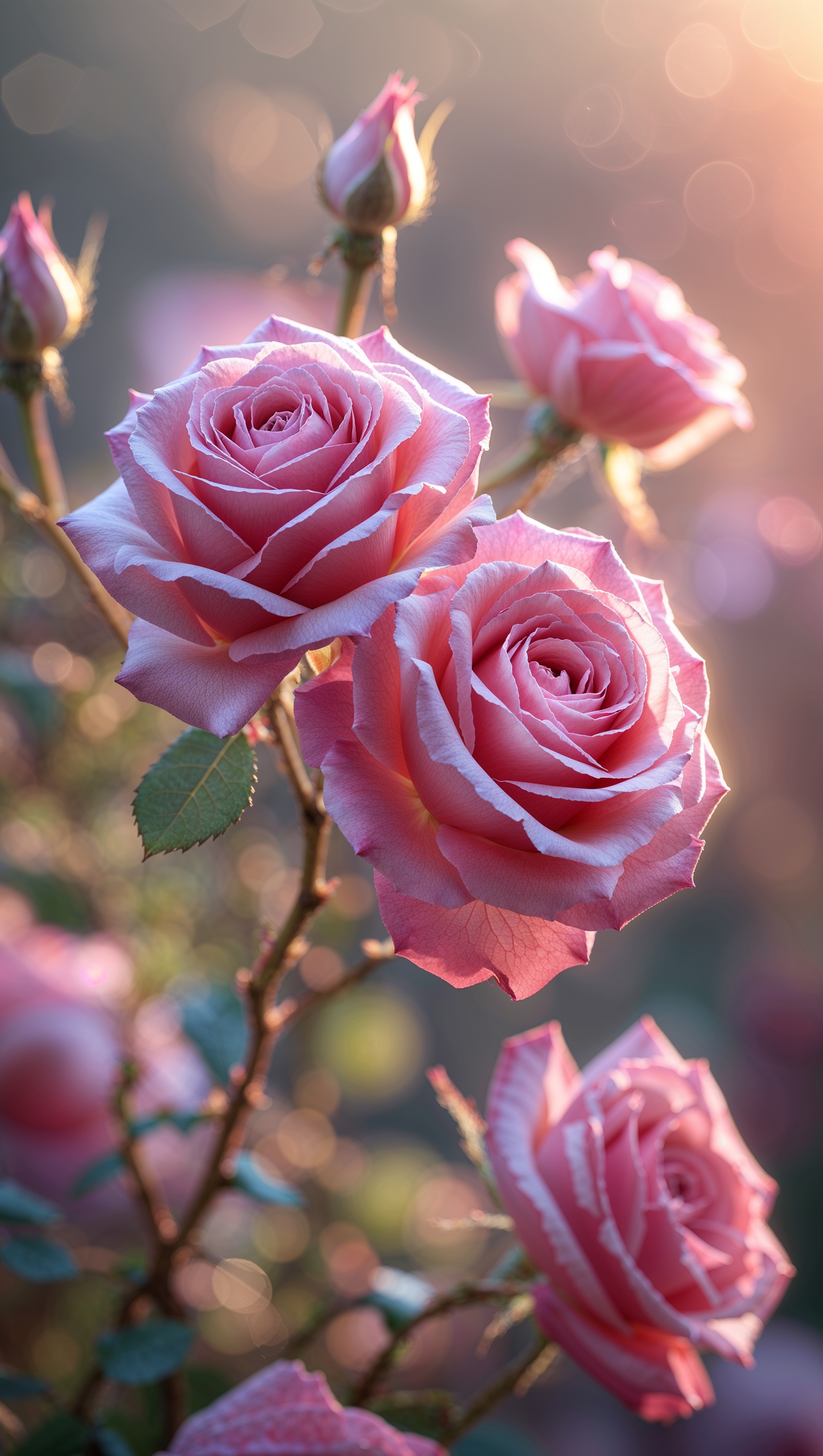 Close-up of pink roses with soft sunlight and gentle bokeh background 1664x2944 Close-up of pink roses with soft sunlight and gentle bokeh background