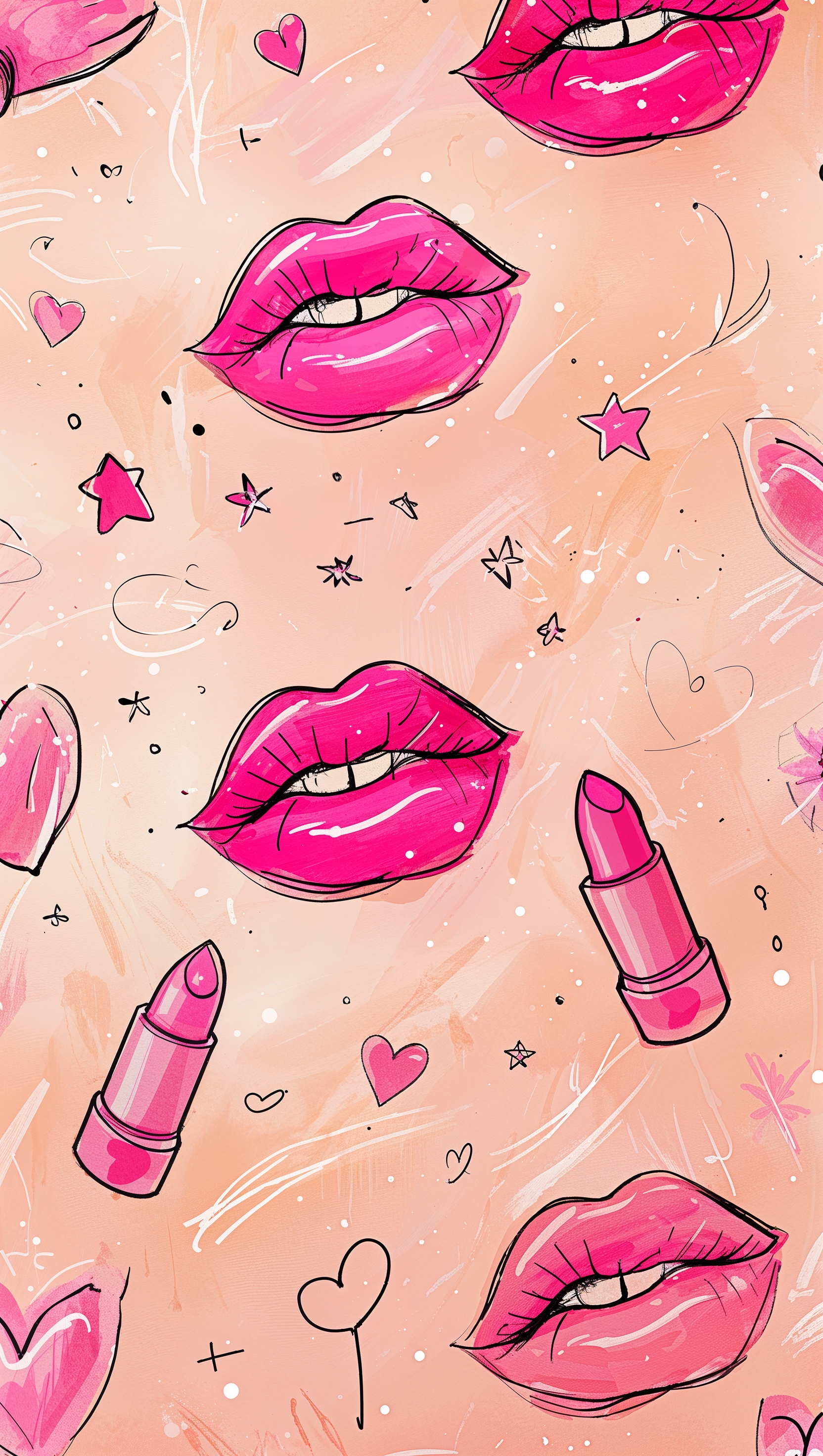 Girly doodles of lipstick, hearts, and stars on soft peach background 1664x2944 Girly doodles of lipstick, hearts, and stars on soft peach background