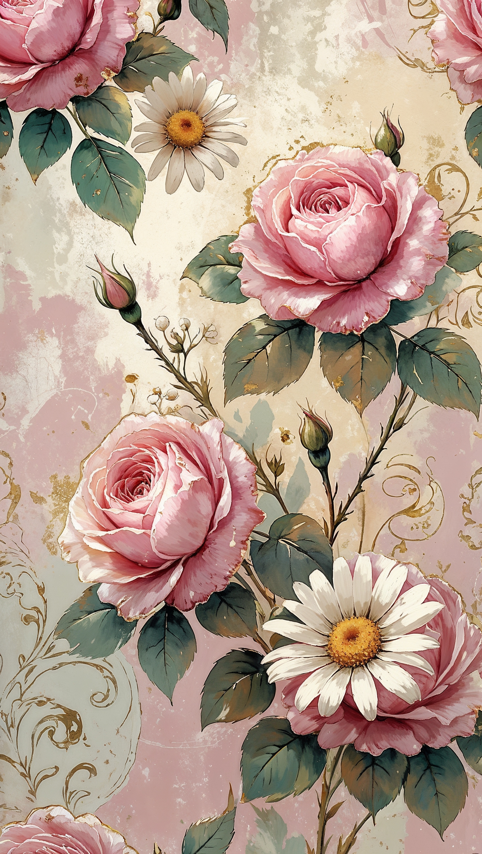 Vintage floral wallpaper with roses and daisies in muted pink and cream 1664x2944 Vintage floral wallpaper with roses and daisies in muted pink and cream