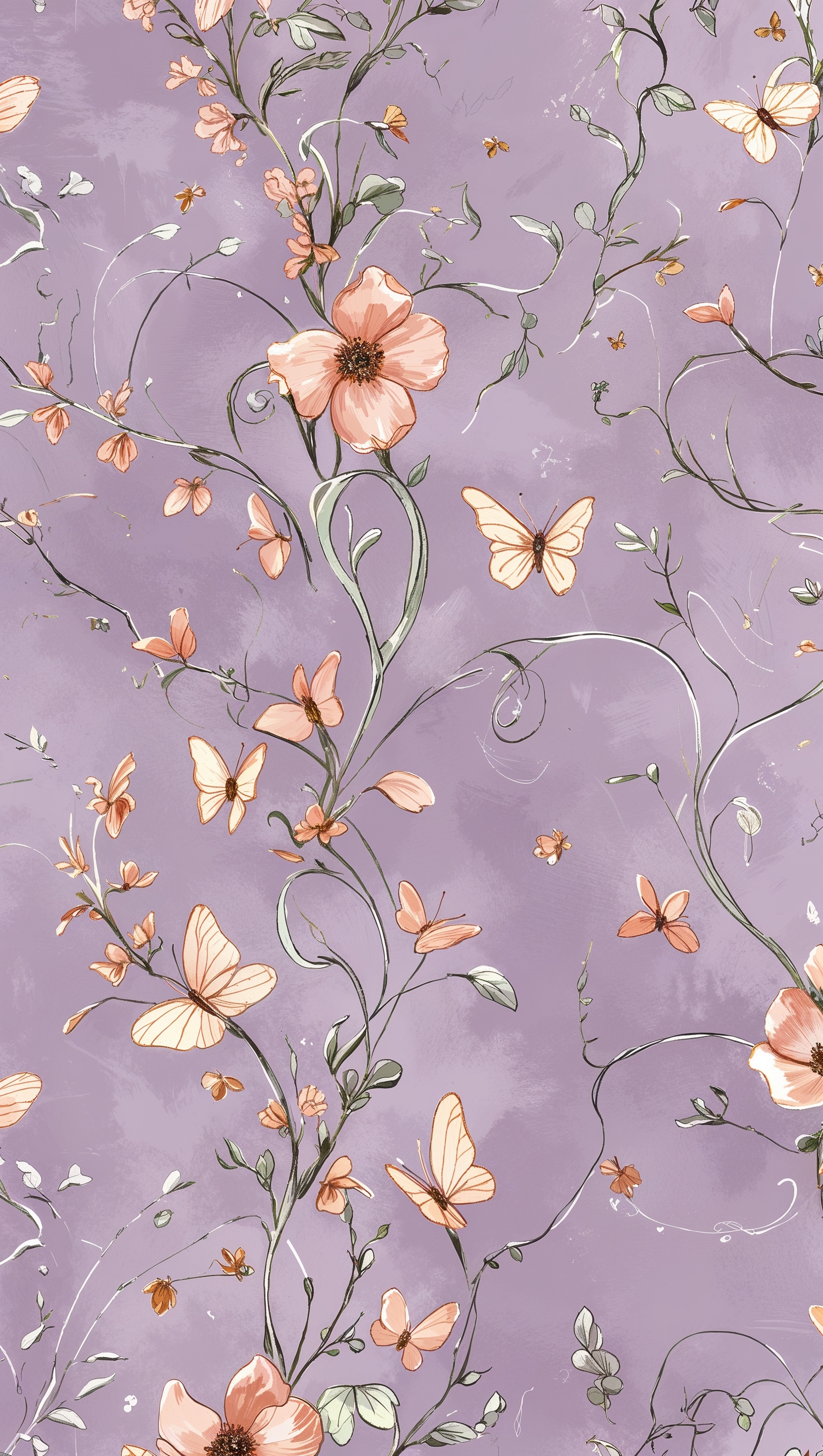 Hand-drawn floral pattern with tiny butterflies on pastel lilac 1664x2944 Hand-drawn floral pattern with tiny butterflies on pastel lilac