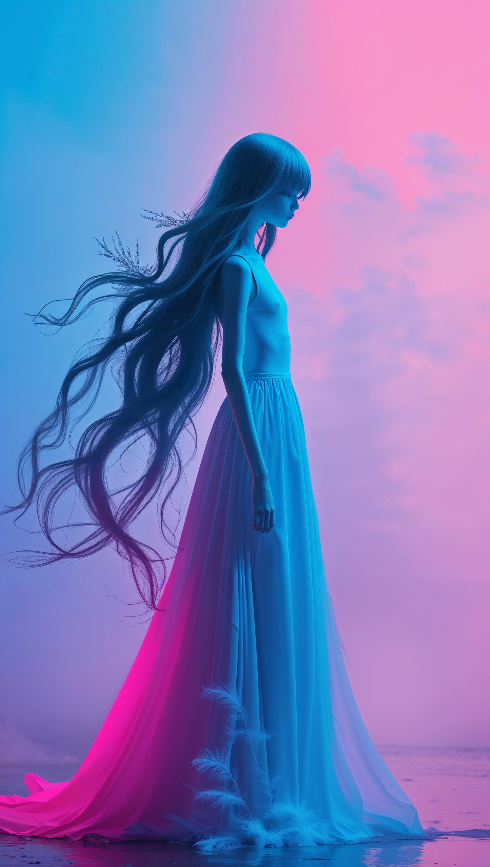 Girl silhouette with flowing hair in neon blue and pink gradient background 1664x2944 Girl silhouette with flowing hair in neon blue and pink gradient background