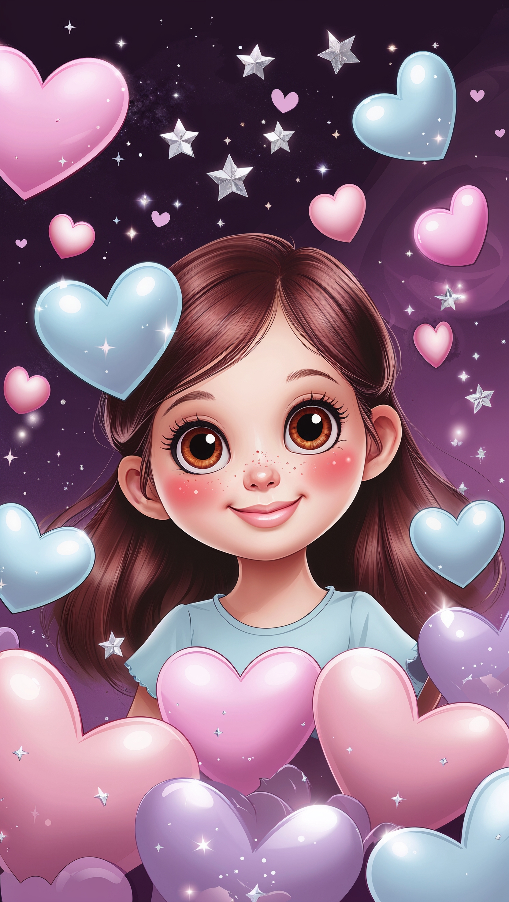 Cute cartoon girl surrounded by floating hearts and stars on dark purple 1664x2944 Cute cartoon girl surrounded by floating hearts and stars on dark purple