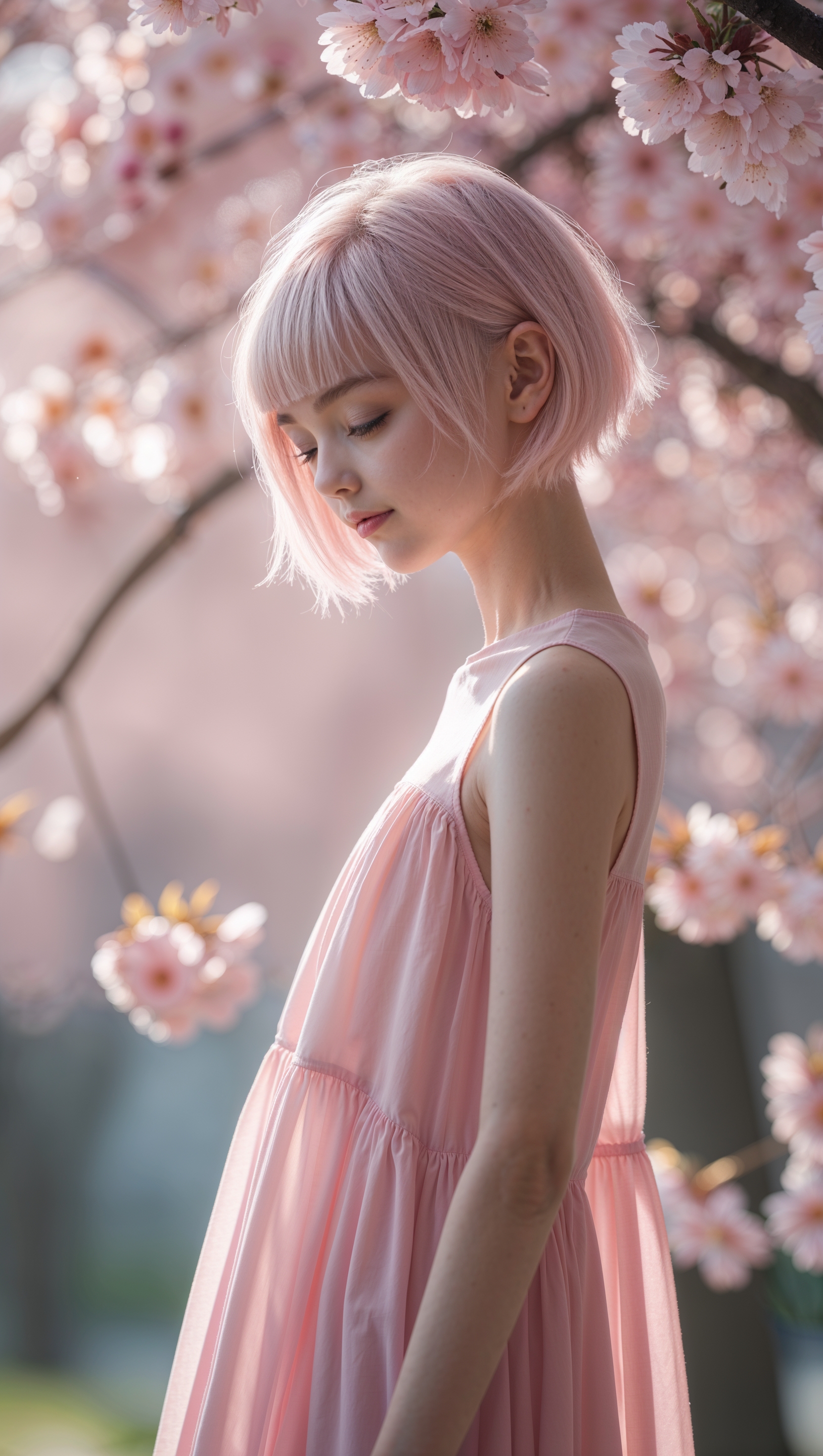 Aesthetic girl with short hair standing under cherry blossoms, soft pink tones, vertical iPhone format 1664x2944 Aesthetic girl with short hair standing under cherry blossoms, soft pink tones, vertical iPhone format