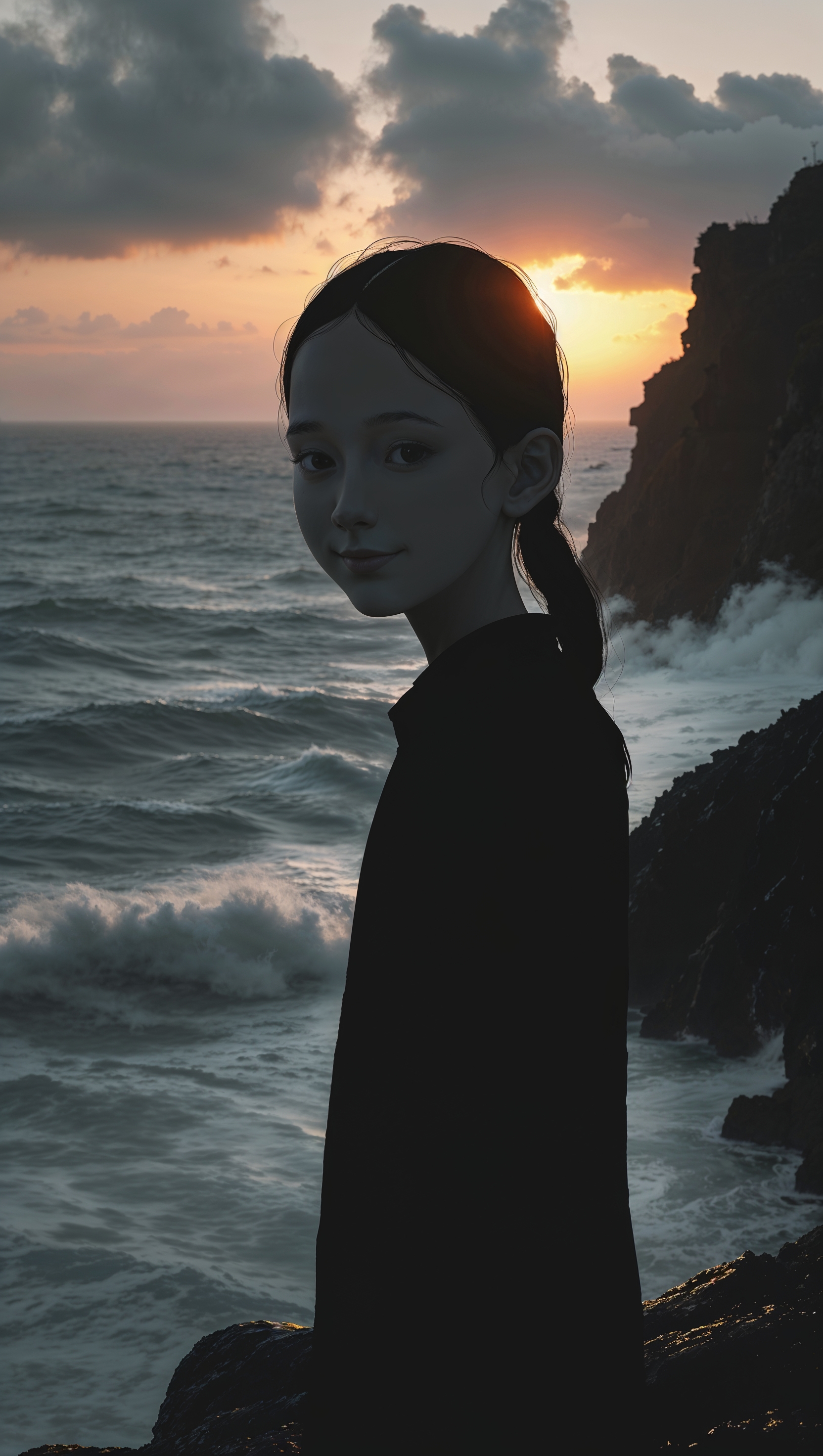Minimalist black and white silhouette of a girl facing the sea at sunset 1664x2944 Minimalist black and white silhouette of a girl facing the sea at sunset