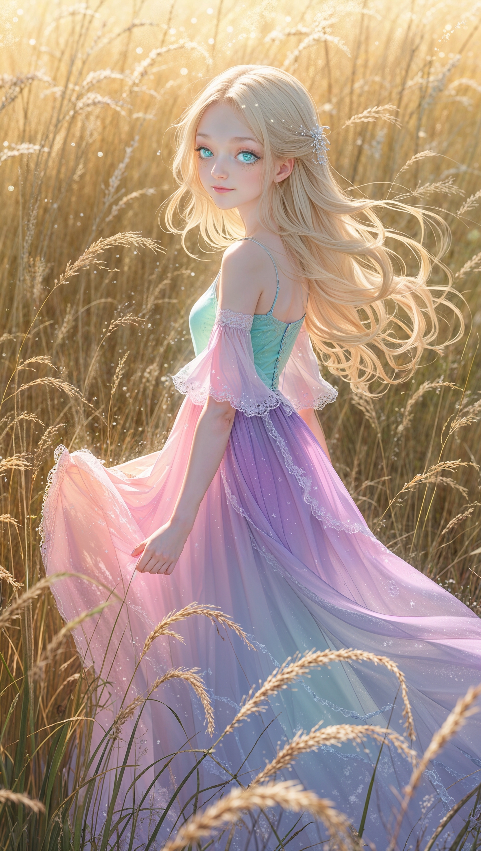 Anime-style girl in a flowing dress standing in a field of tall grass 1664x2944 Anime-style girl in a flowing dress standing in a field of tall grass