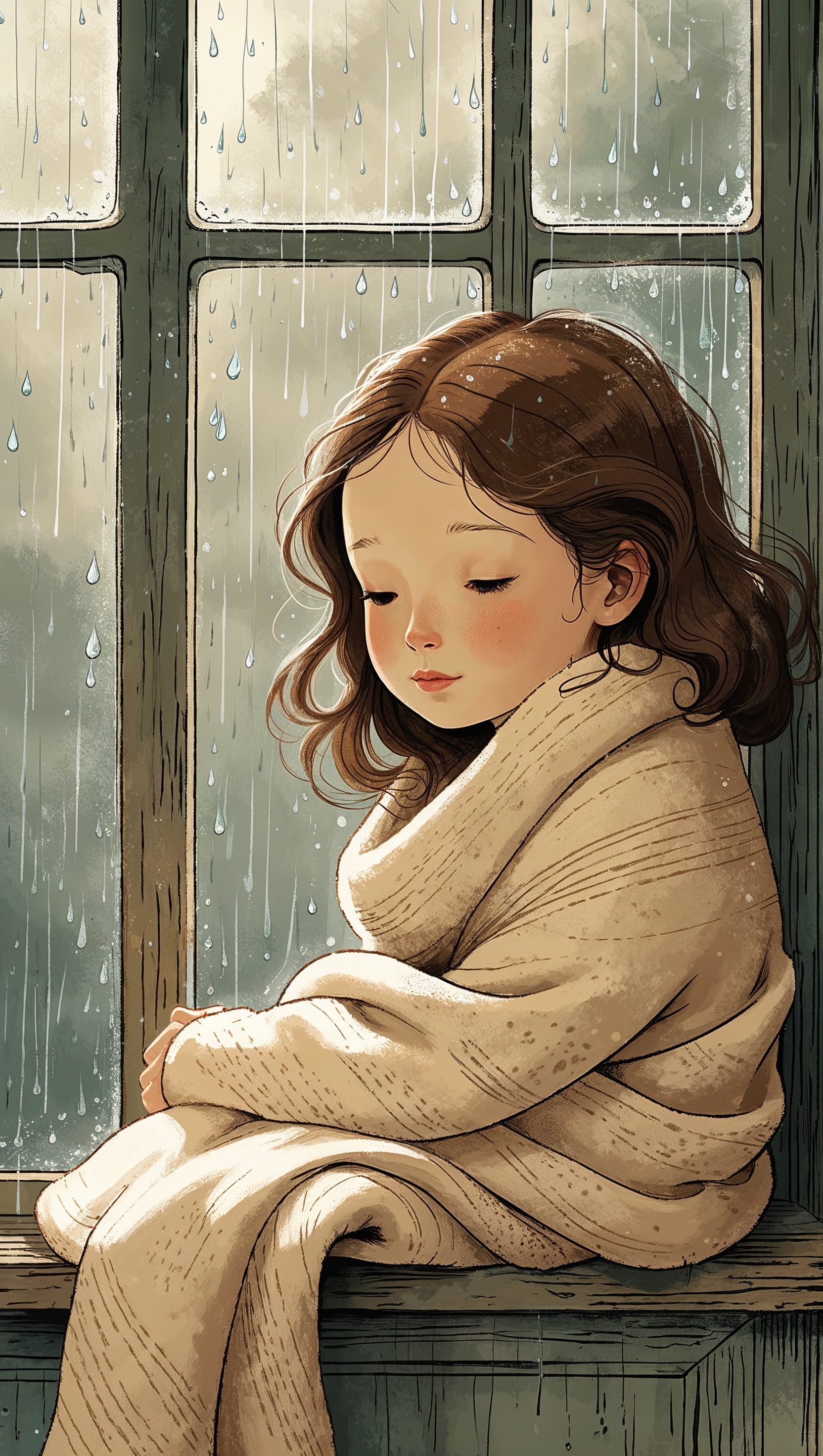 Illustration of girl sitting on windowsill watching the rain, cozy atmosphere 1664x2944 Illustration of girl sitting on windowsill watching the rain, cozy atmosphere