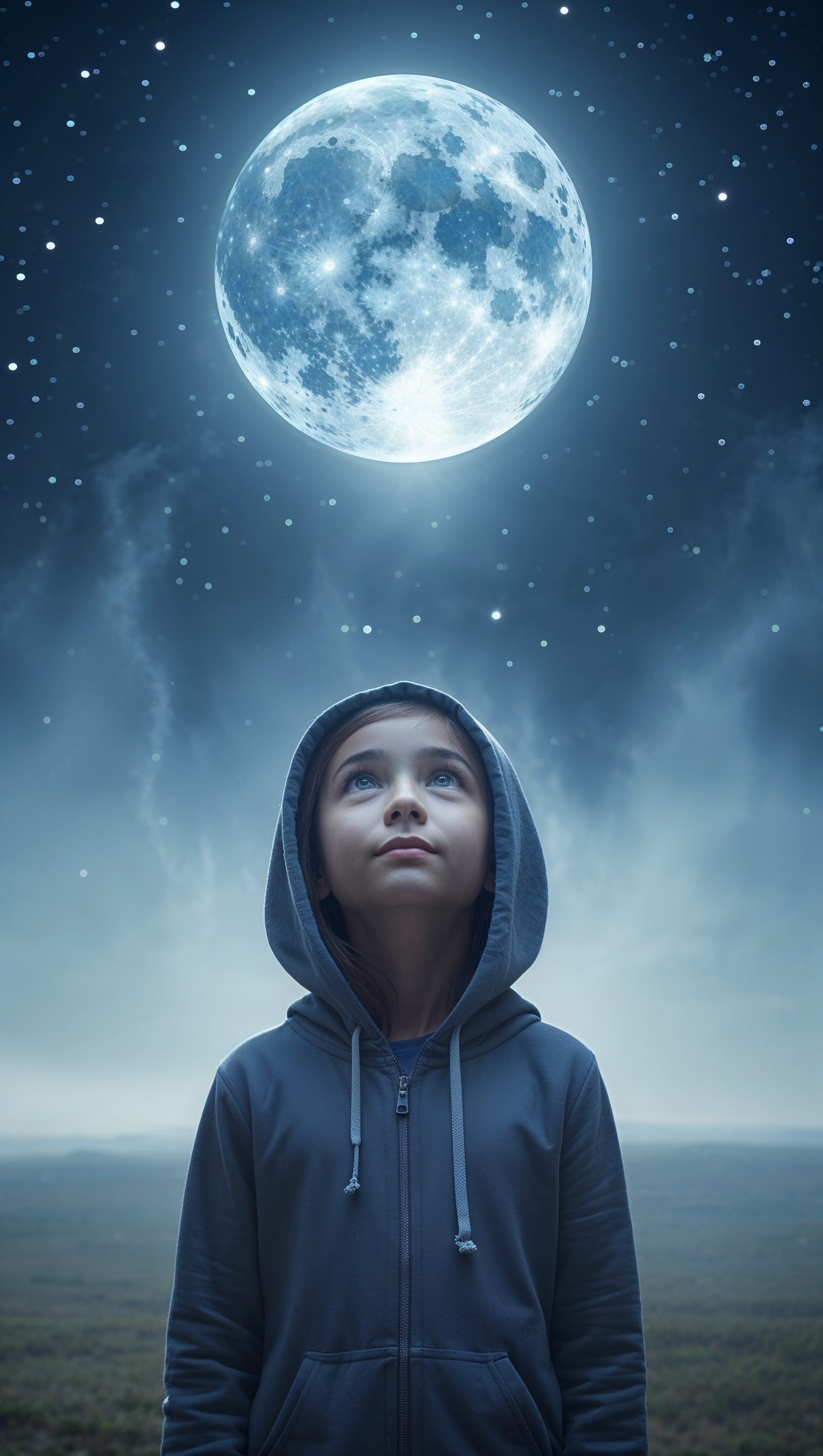 Young girl in a hoodie looking up at the stars, with glowing moon above 1664x2944 Young girl in a hoodie looking up at the stars, with glowing moon above