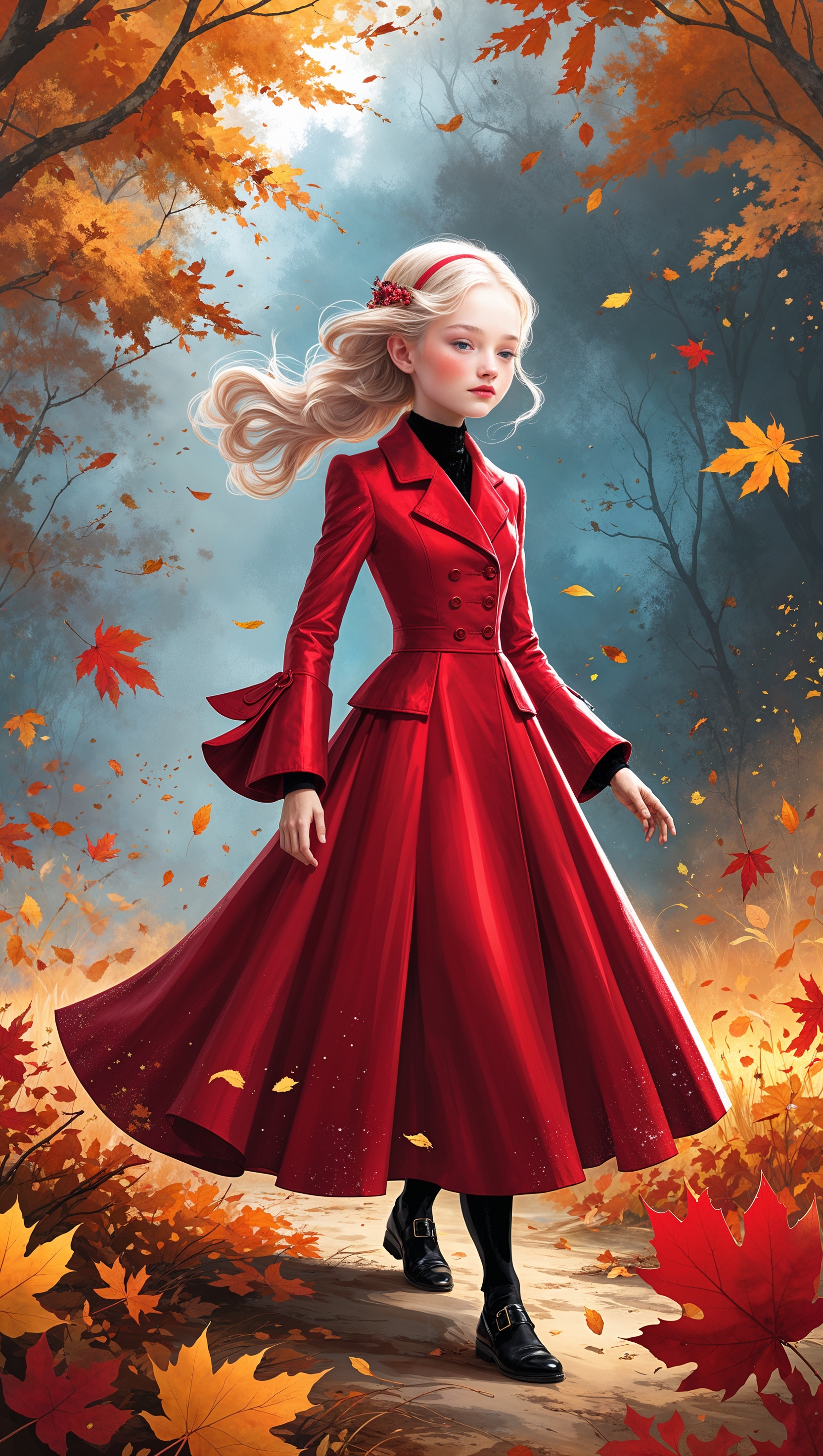 Elegant fashion illustration of girl in red coat walking in autumn leaves 1664x2944 Elegant fashion illustration of girl in red coat walking in autumn leaves