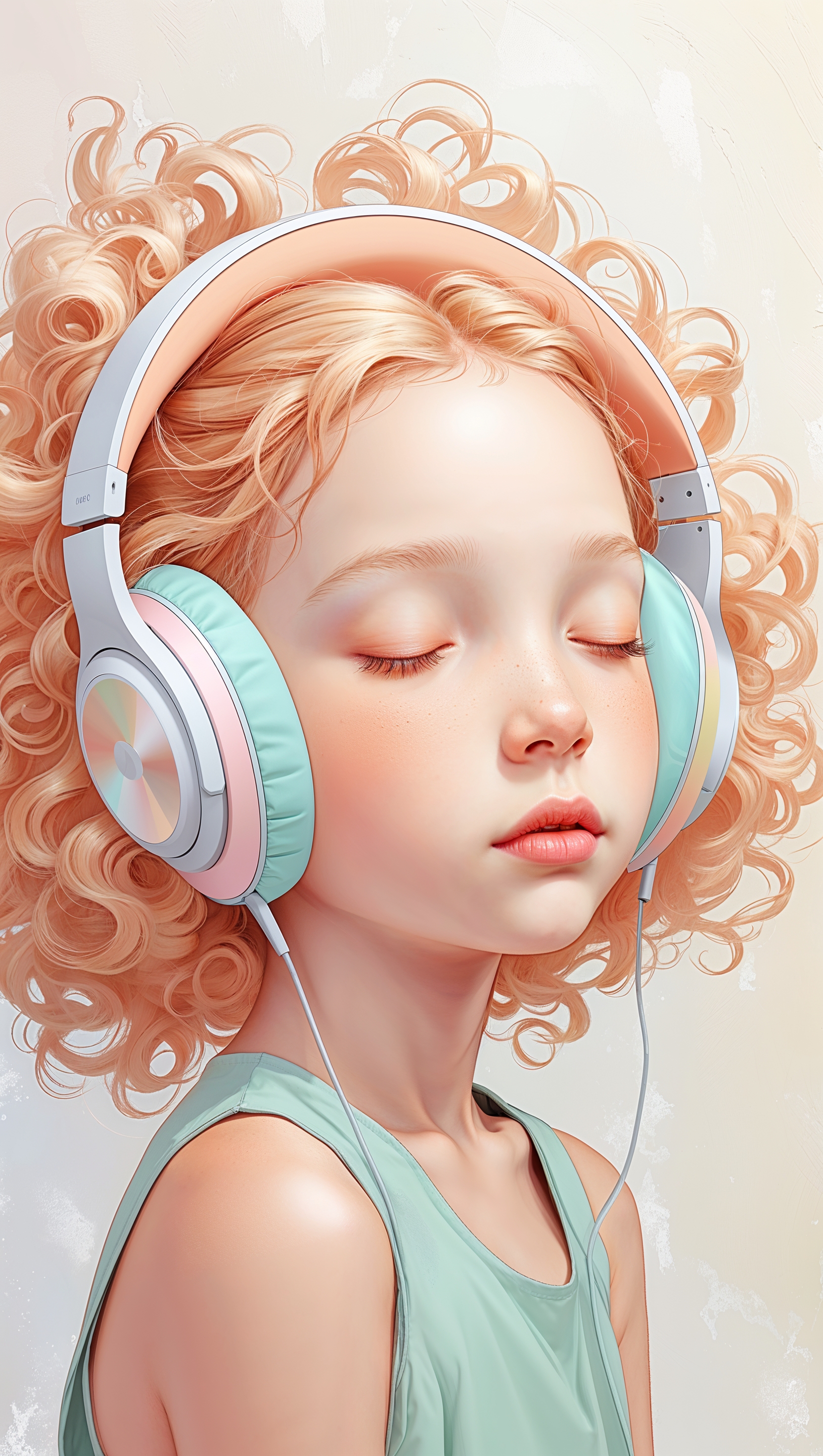 Flat digital art of girl wearing headphones, lost in music, soft pastels 1664x2944 Flat digital art of girl wearing headphones, lost in music, soft pastels