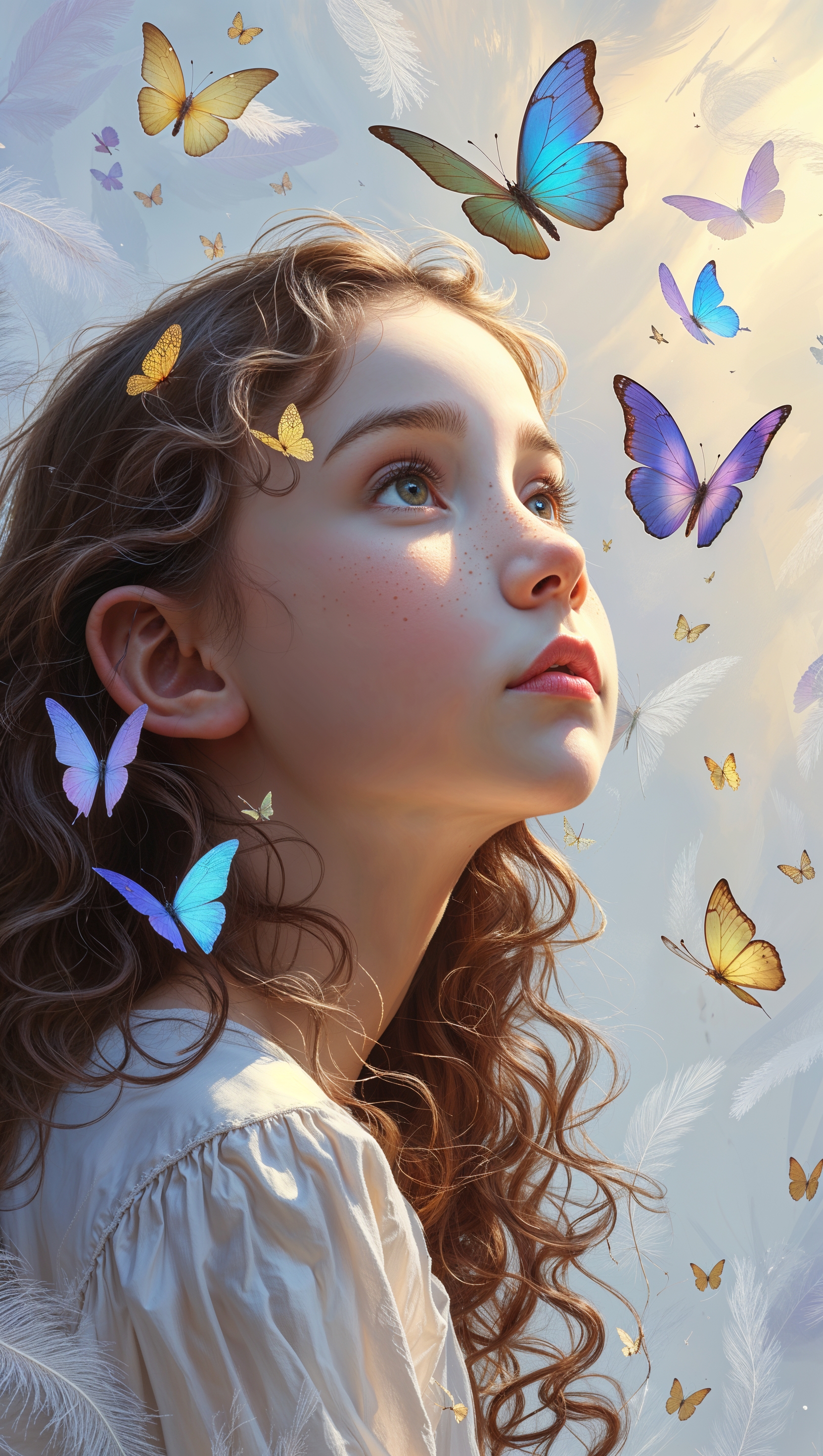 Profile view of a dreamy girl surrounded by floating butterflies 1664x2944 Profile view of a dreamy girl surrounded by floating butterflies
