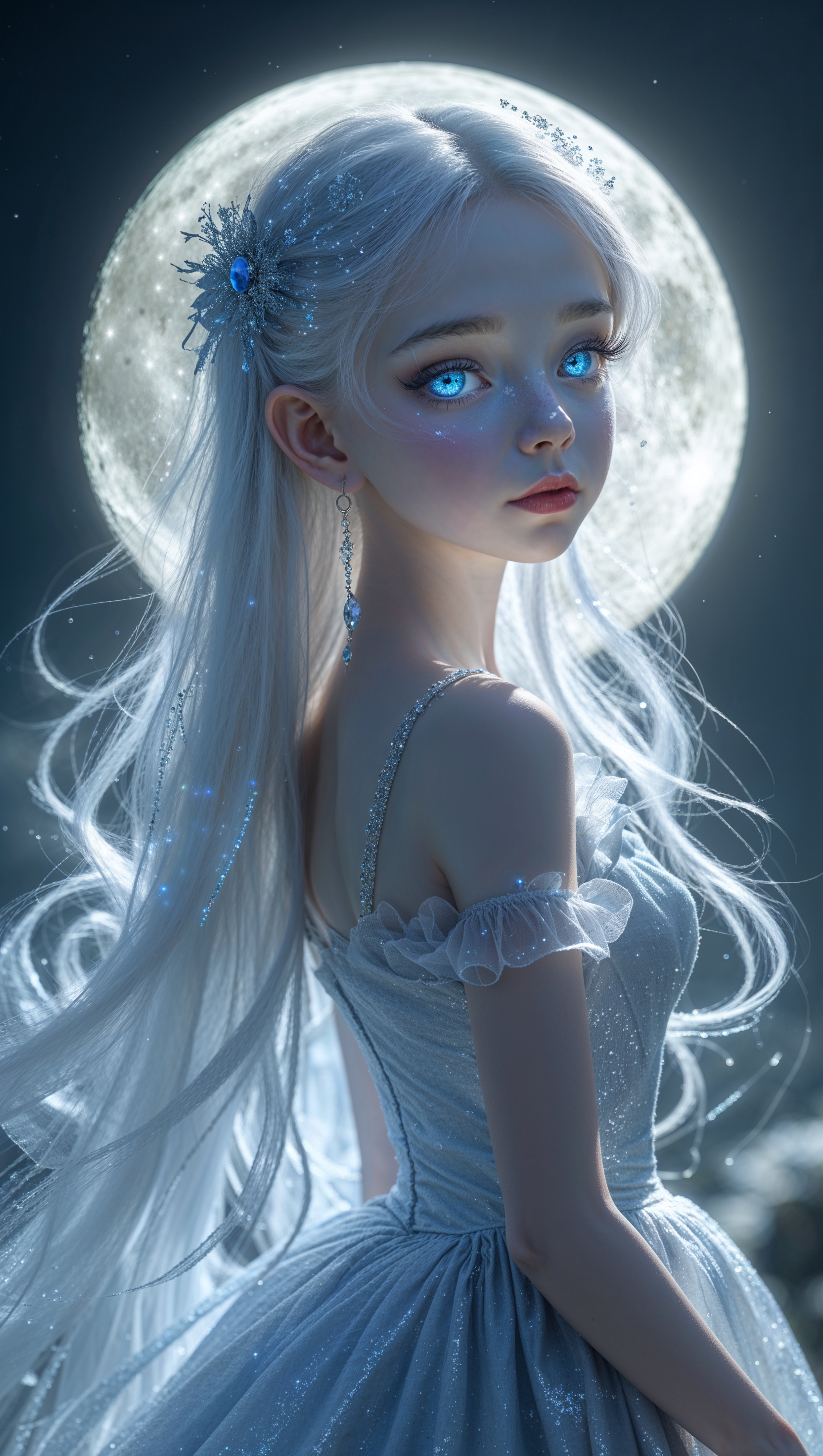 Fantasy girl with glowing blue eyes and long silver hair under moonlight 1664x2944 Fantasy girl with glowing blue eyes and long silver hair under moonlight