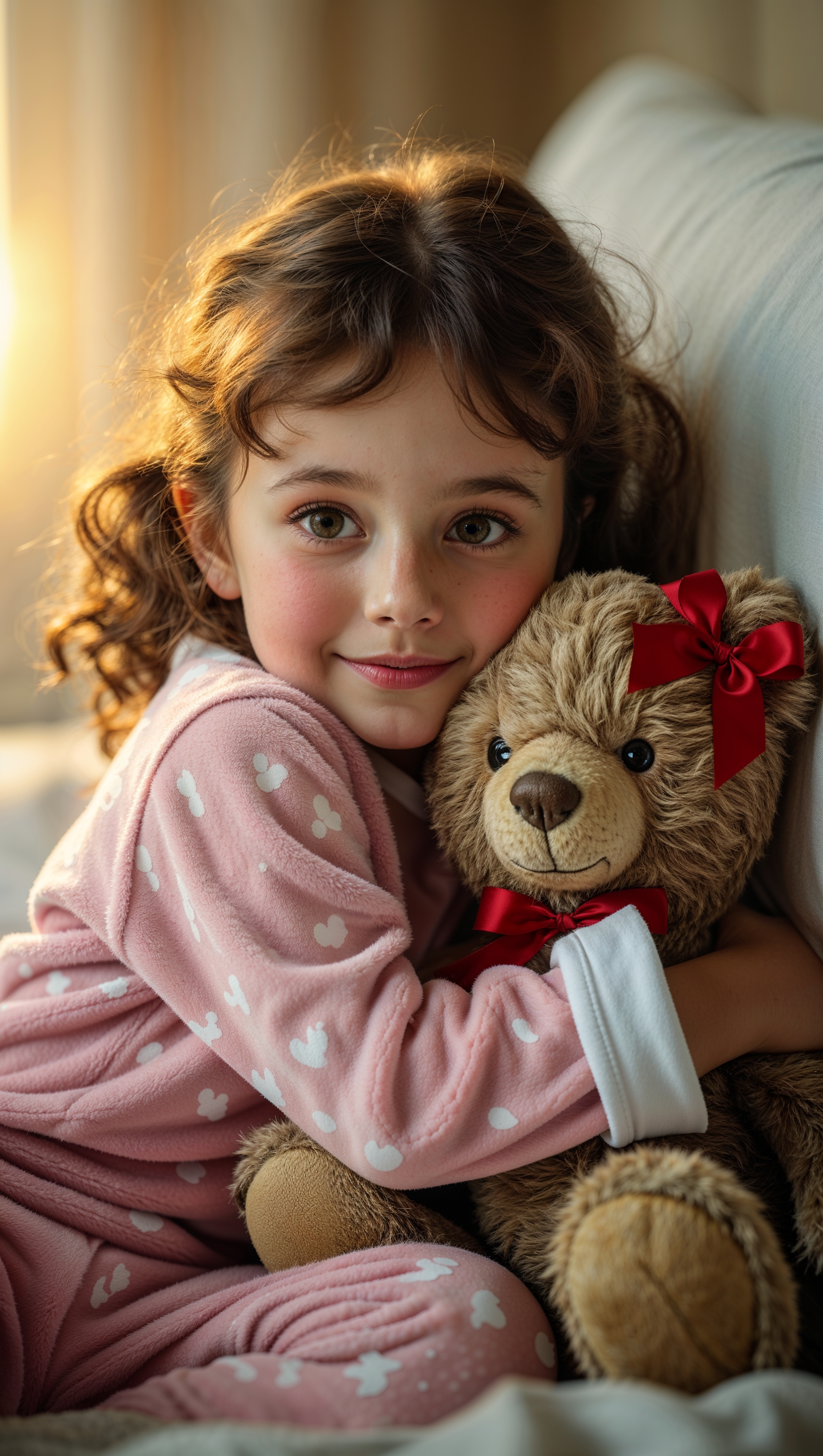 Girl in bunny pajamas hugging a stuffed animal, soft bedroom light 1664x2944 Girl in bunny pajamas hugging a stuffed animal, soft bedroom light