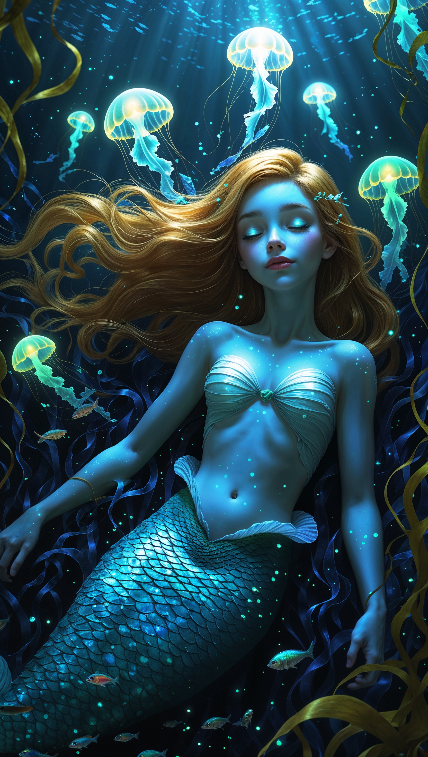Mermaid girl under water, surrounded by glowing jellyfish 1664x2944 Mermaid girl under water, surrounded by glowing jellyfish