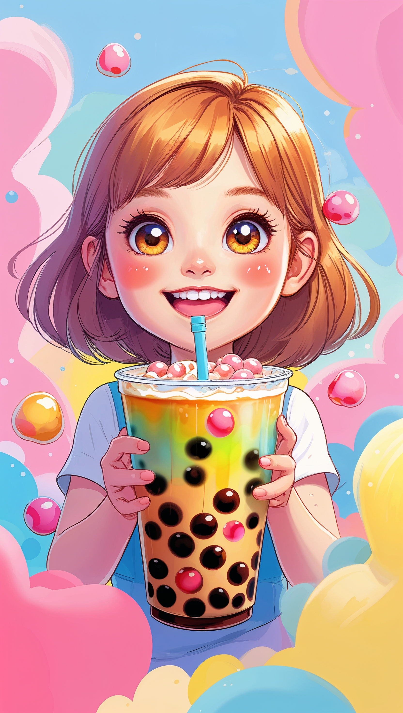 Cute chibi-style girl drinking boba tea with bright smile 1664x2944 Cute chibi-style girl drinking boba tea with bright smile