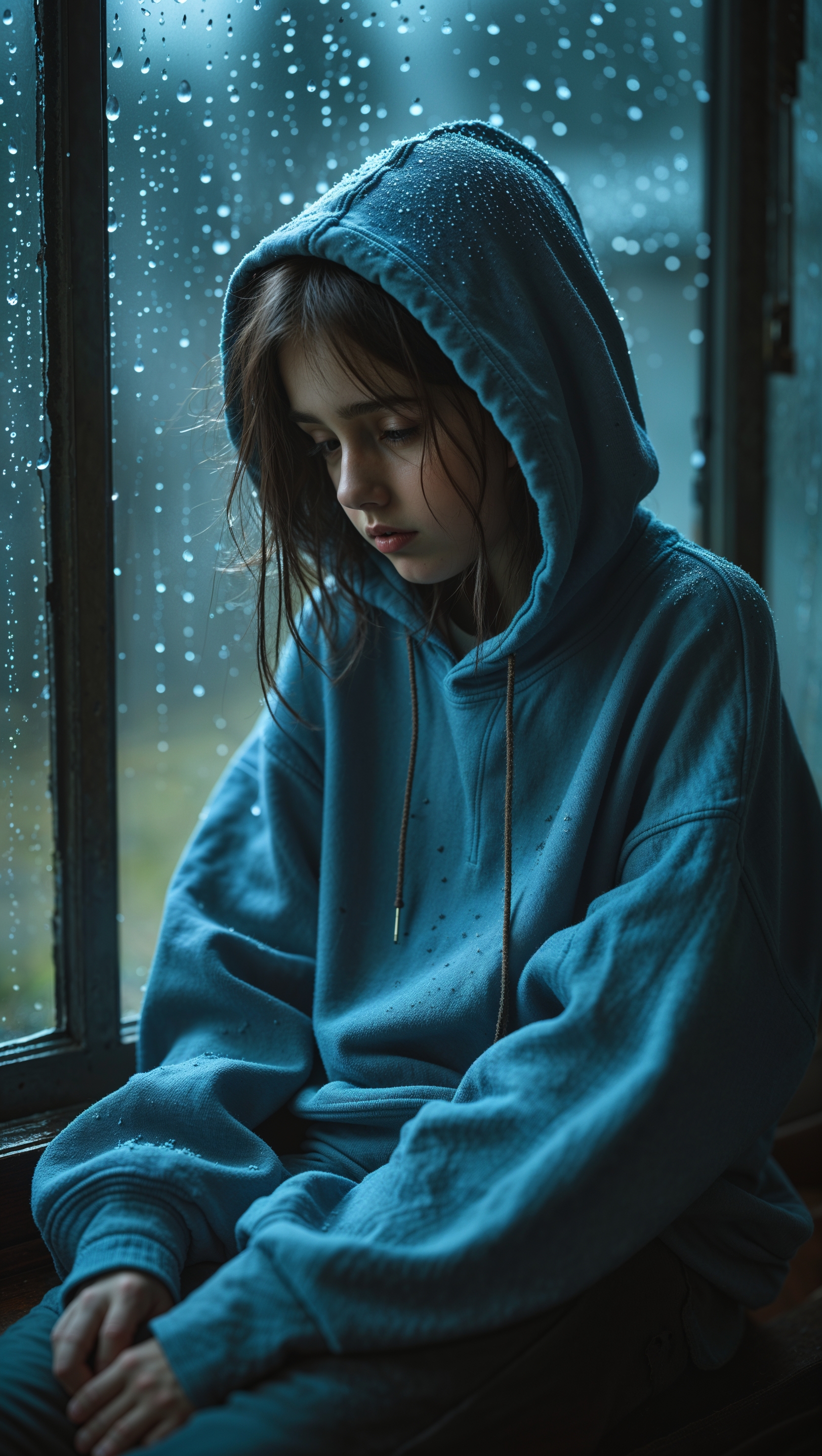 Sad girl with hoodie sitting by rainy window, soft lighting and mood 1664x2944 Sad girl with hoodie sitting by rainy window, soft lighting and mood