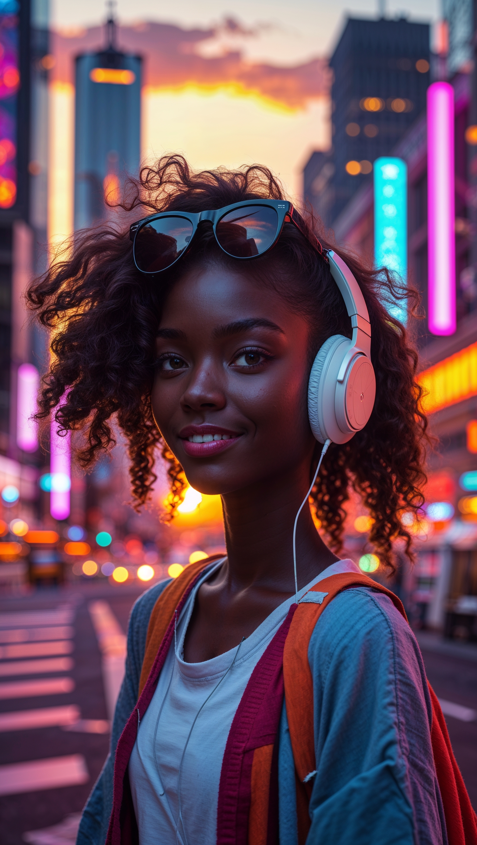 Urban girl with sunglasses and headphones walking in city at sunset 1664x2944 Urban girl with sunglasses and headphones walking in city at sunset