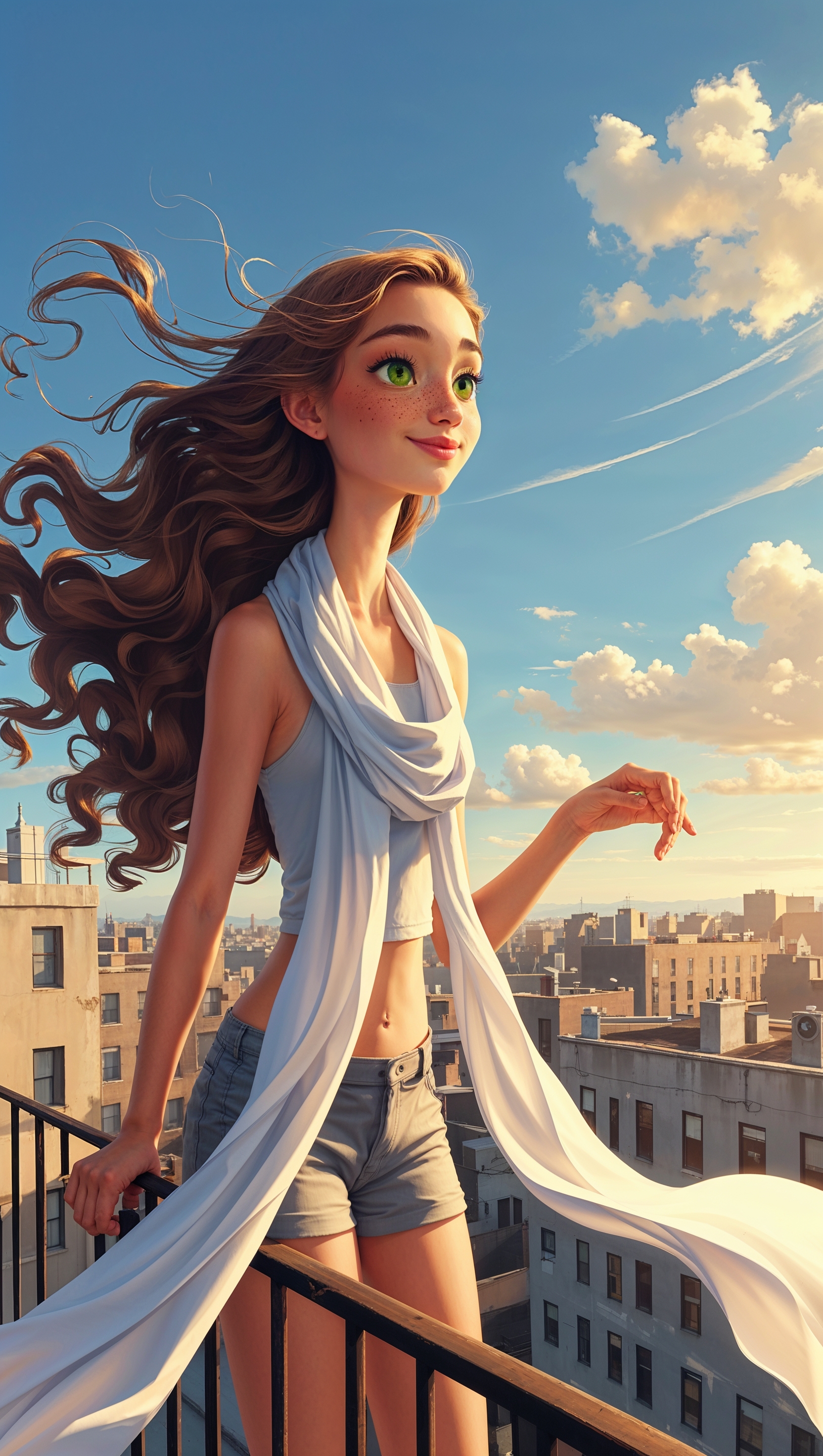 Vertical photo of girl standing on rooftop with flowing scarf in wind 1664x2944 Vertical photo of girl standing on rooftop with flowing scarf in wind