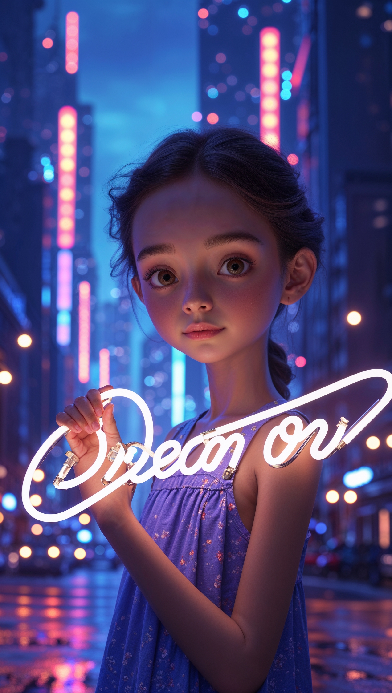 Girl holding glowing neon sign that reads “dream on”, night background 1664x2944 Girl holding glowing neon sign that reads “dream on”, night background