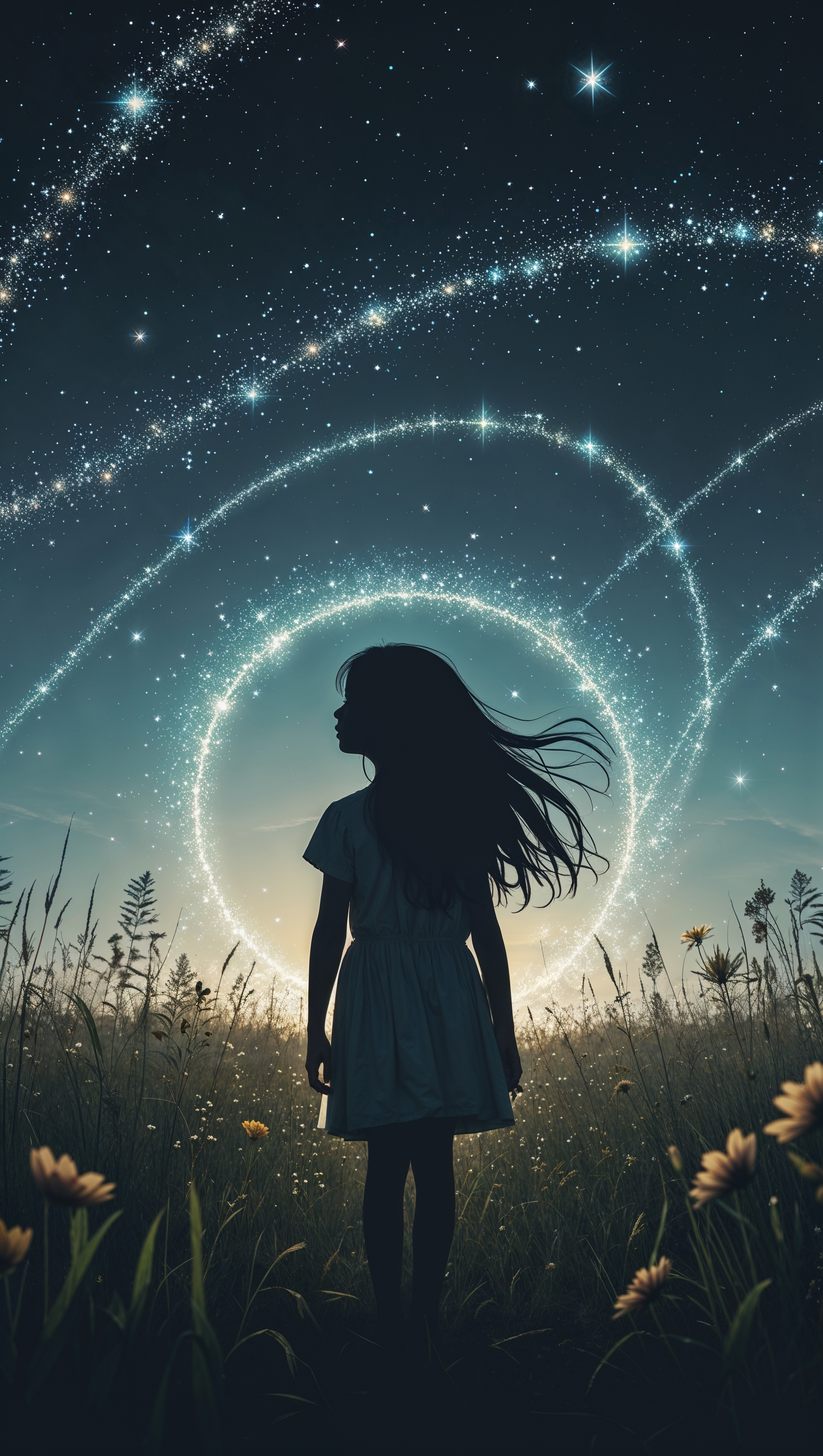 Backlit silhouette of girl standing in field with stars forming a halo 1664x2944 Backlit silhouette of girl standing in field with stars forming a halo