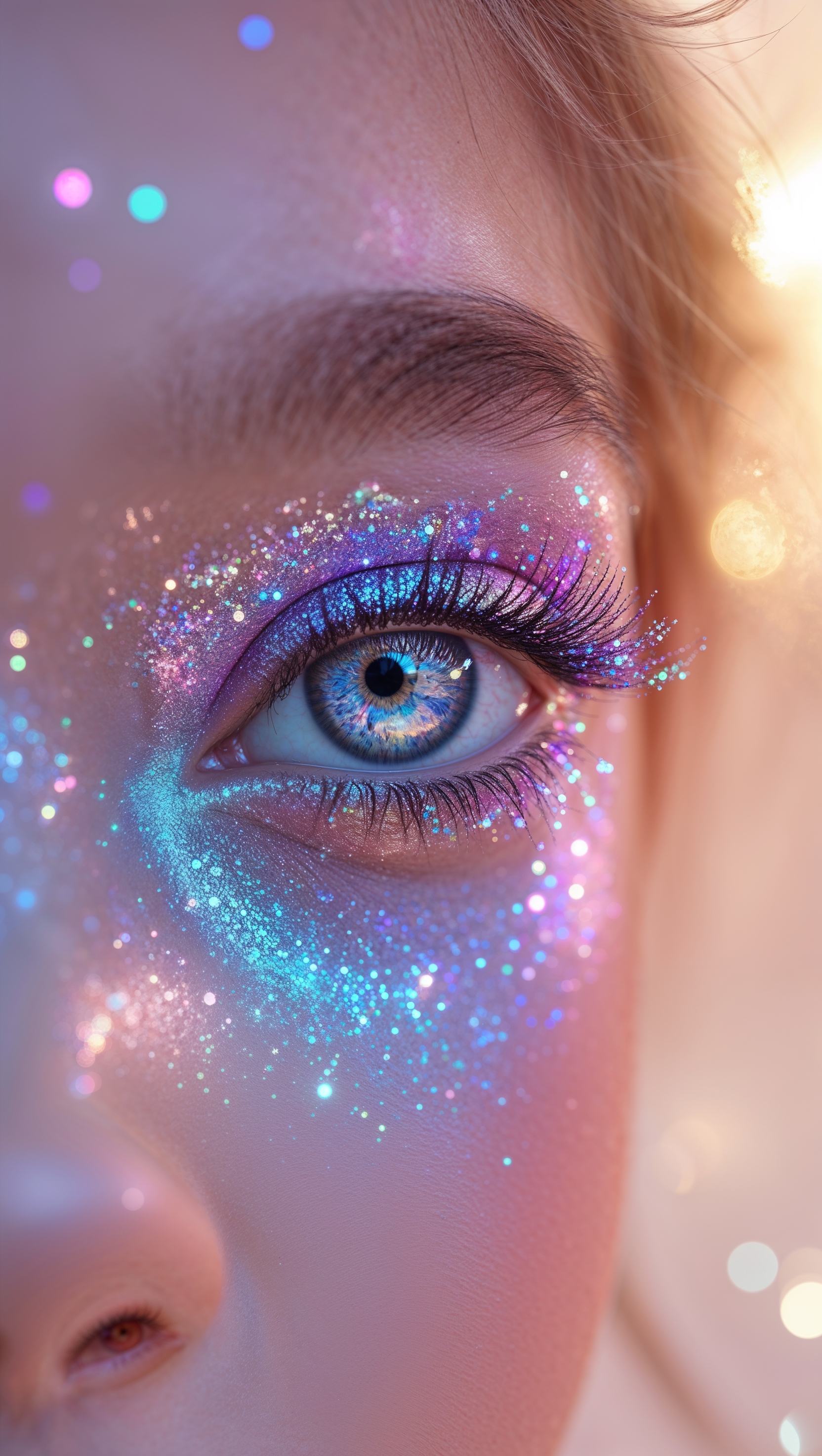 Close-up of girl’s eyes with glitter makeup and soft-focus background 1664x2944 Close-up of girl’s eyes with glitter makeup and soft-focus background
