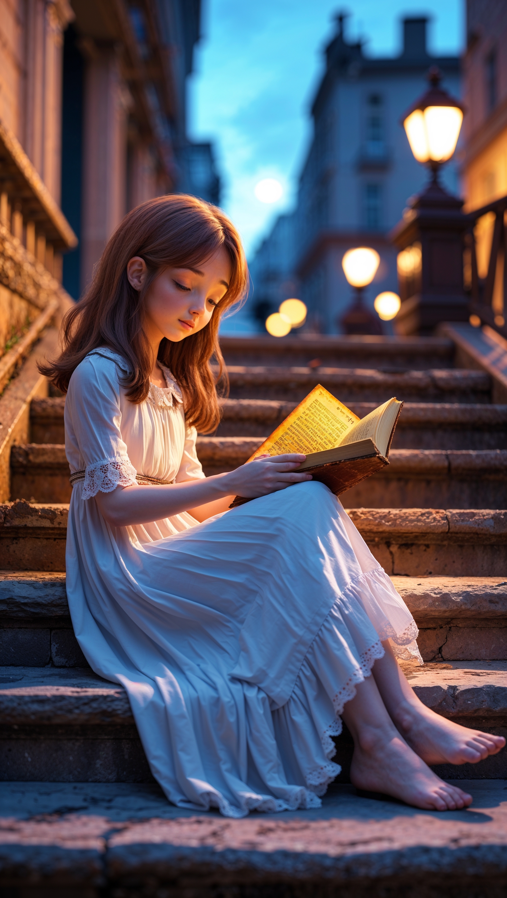 Girl sitting on stairs reading a book, warm city evening lighting 1664x2944 Girl sitting on stairs reading a book, warm city evening lighting