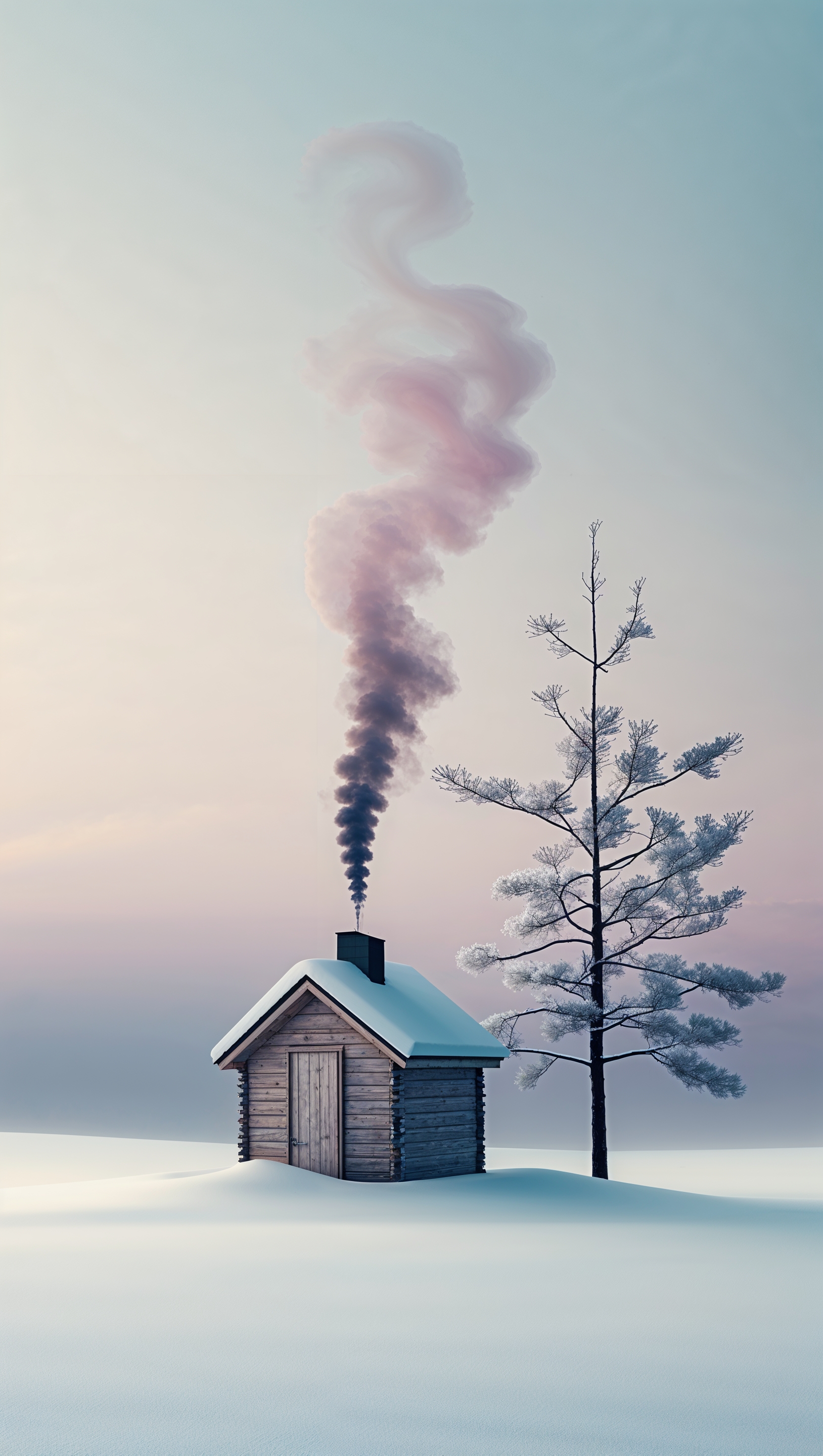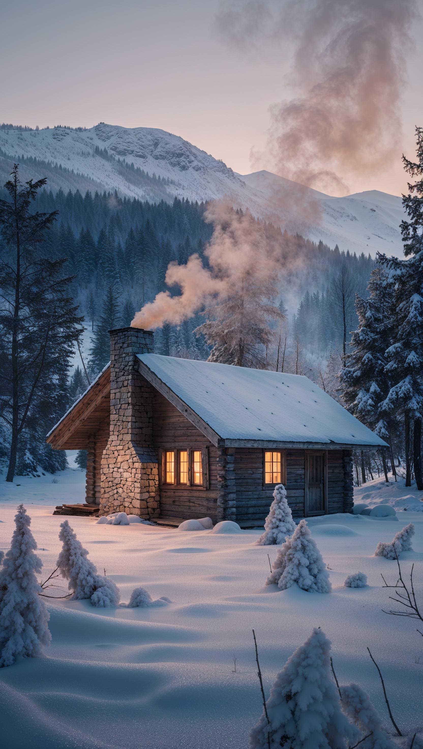 1664x2944 Lonely wooden cabin in snowy valley, smoke rising from chimney, peaceful winter mood