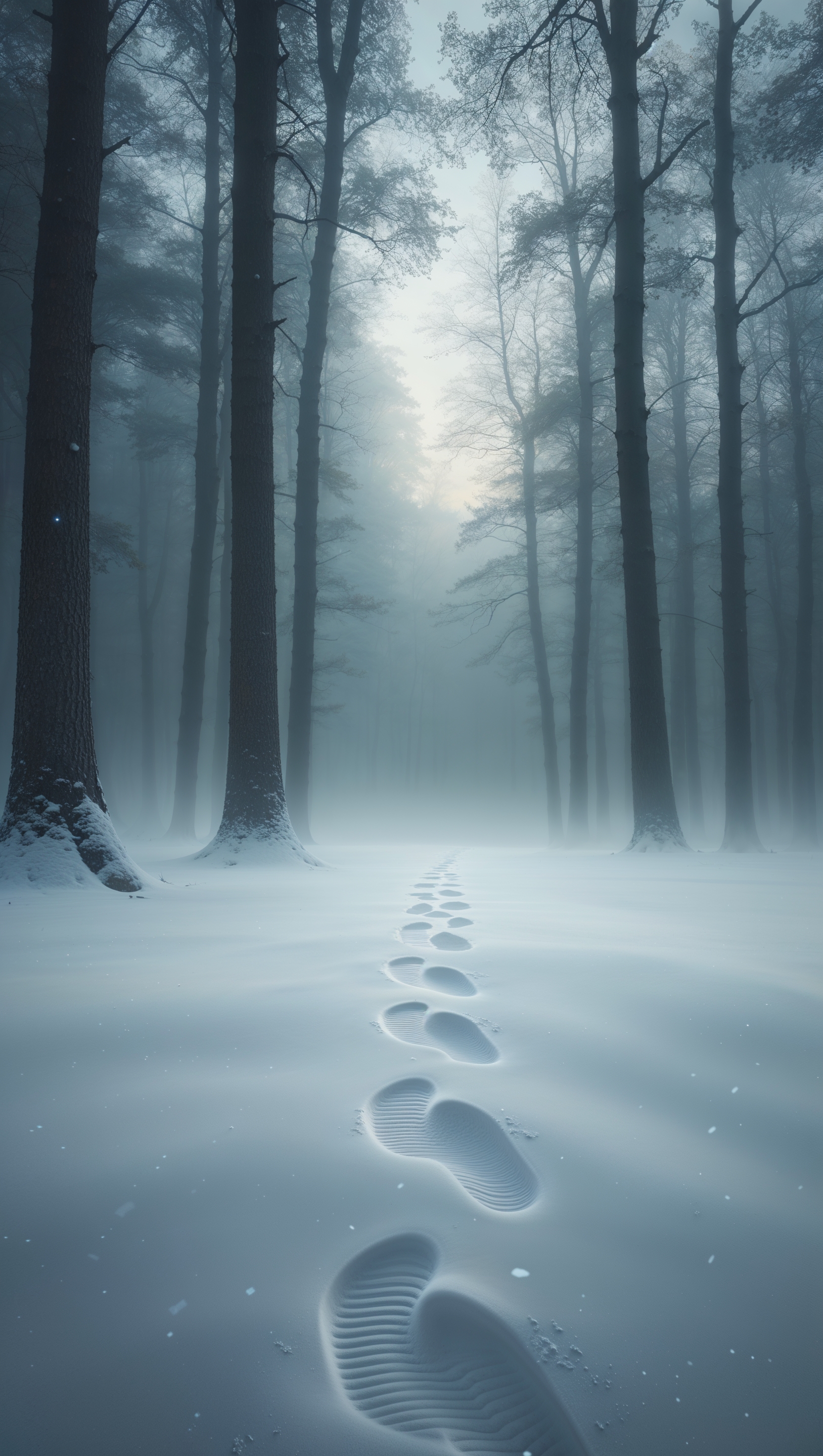 1664x2944 Footprints on fresh snow leading into a quiet foggy forest, vertical composition