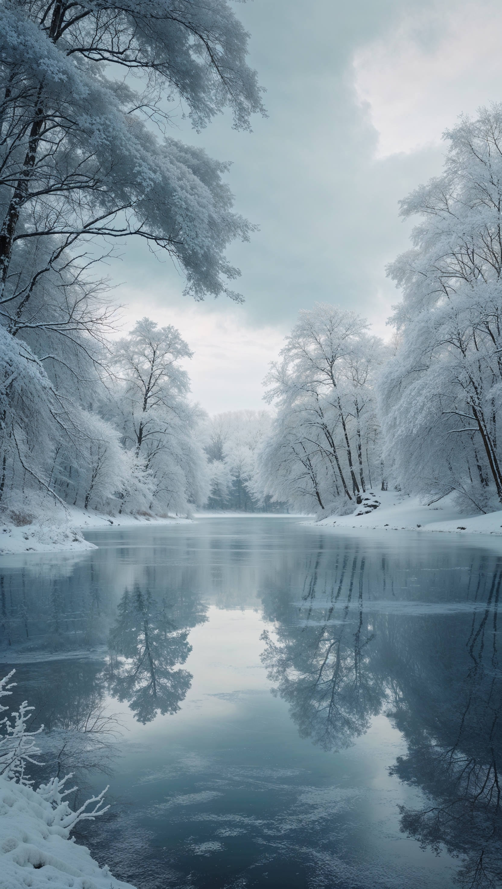 1664x2944 Frozen lake reflecting snow-covered trees, overcast sky above