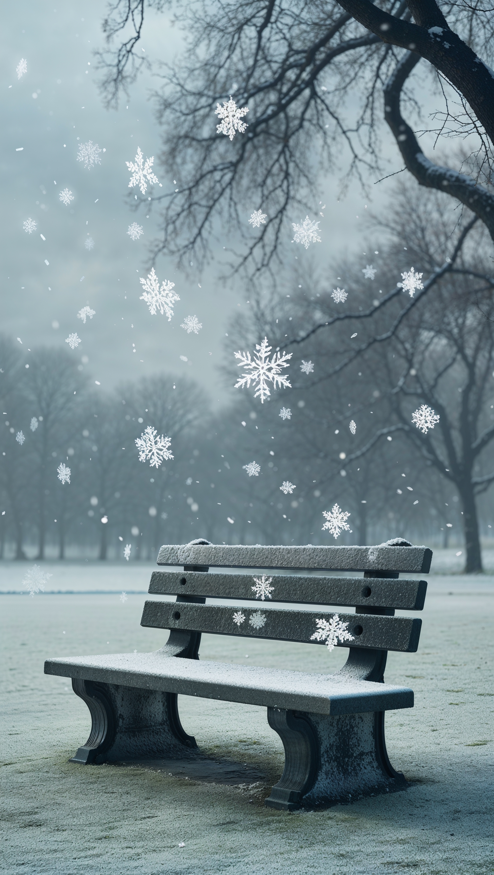 1664x2944 Snowflakes falling gently in slow motion over a stone bench in the park