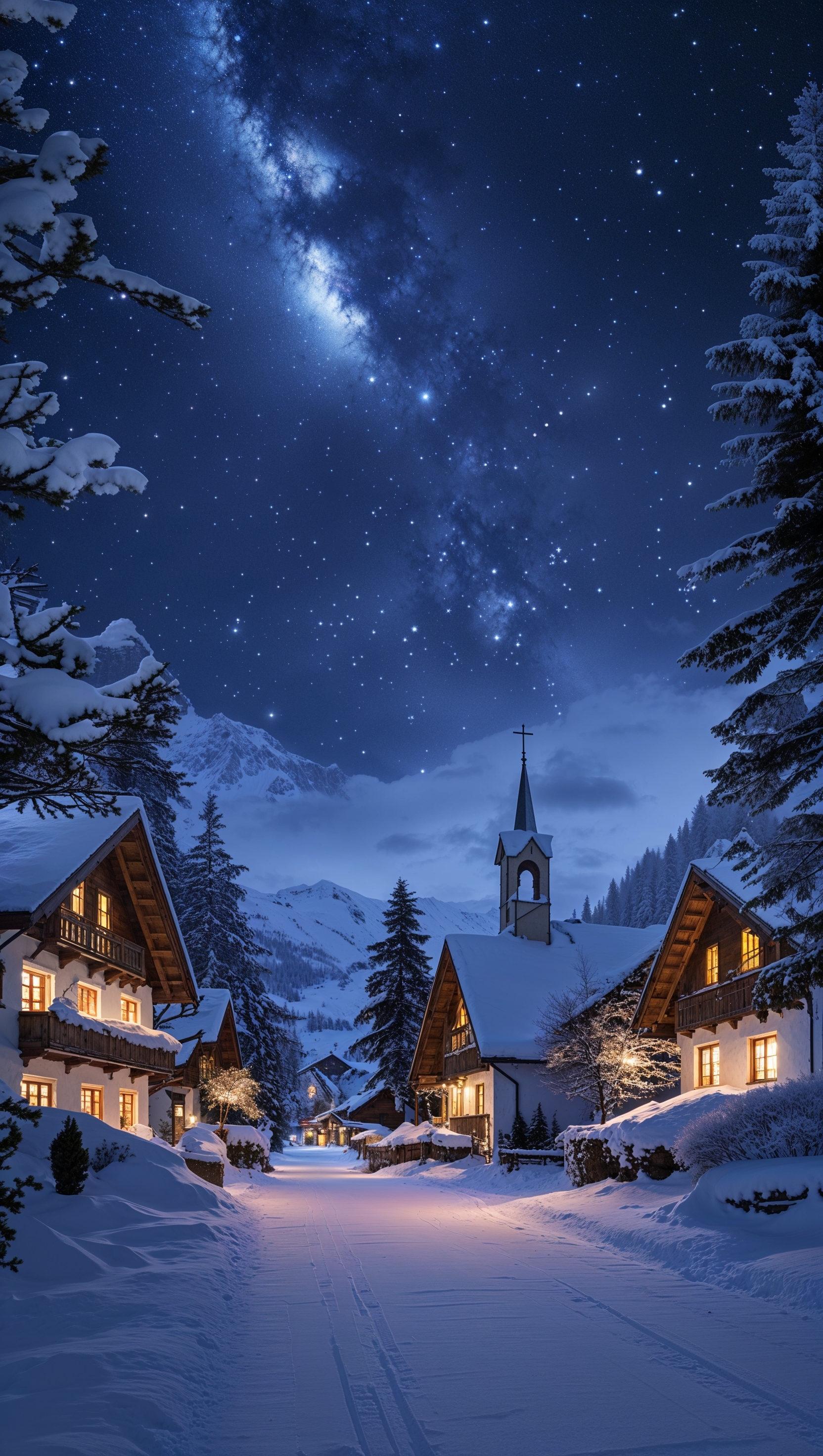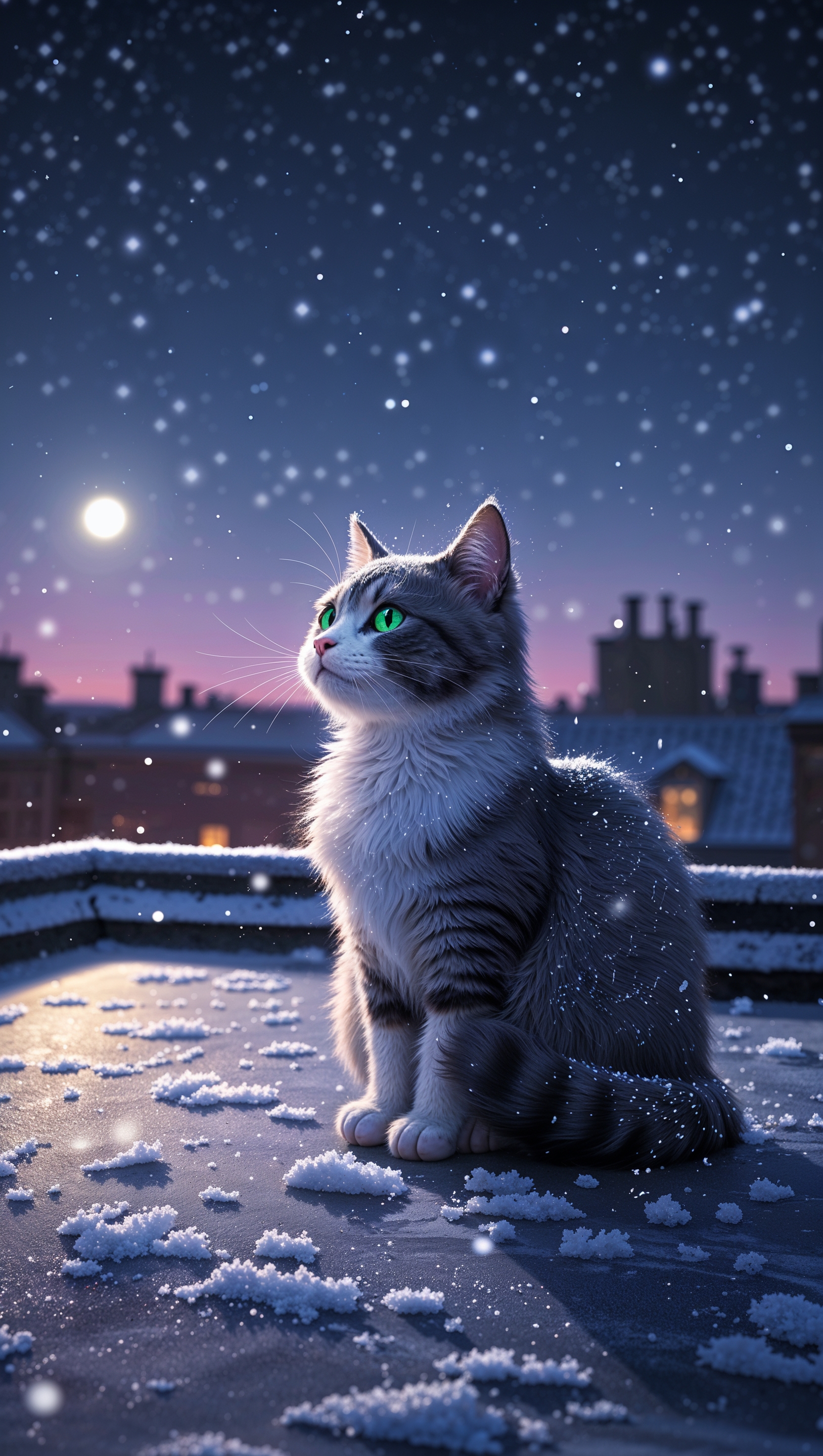 1664x2944 Snowy rooftop with tiny cat sitting and watching the stars