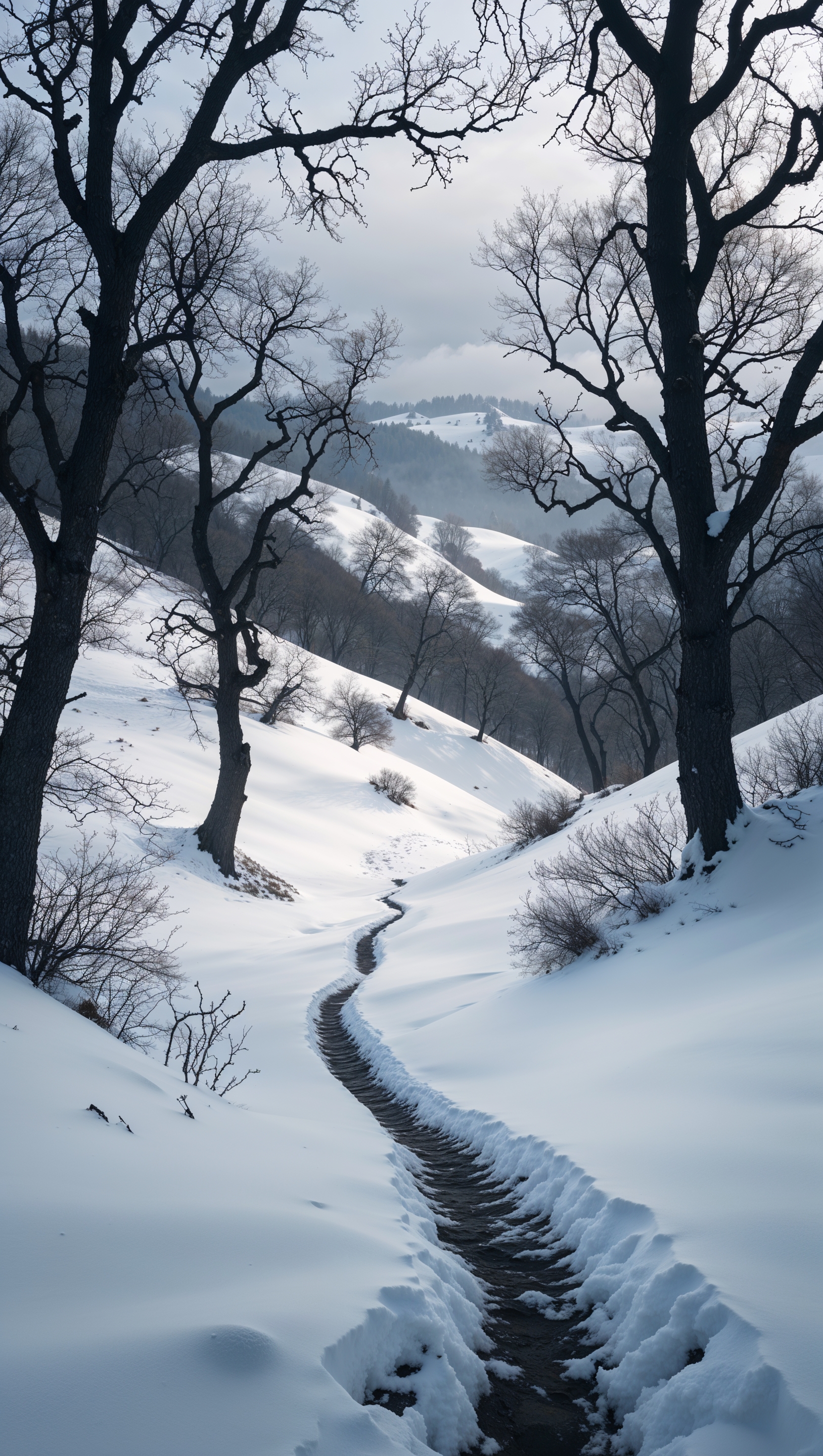 1664x2944 Vertical trail through snow-dusted hills with overhanging trees